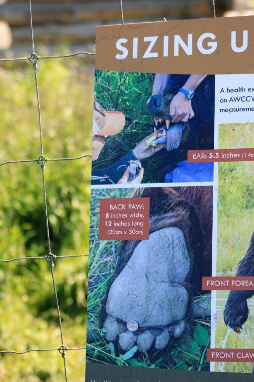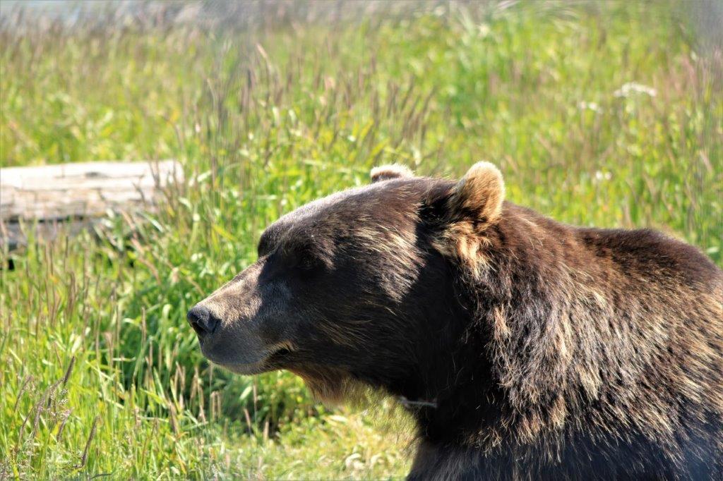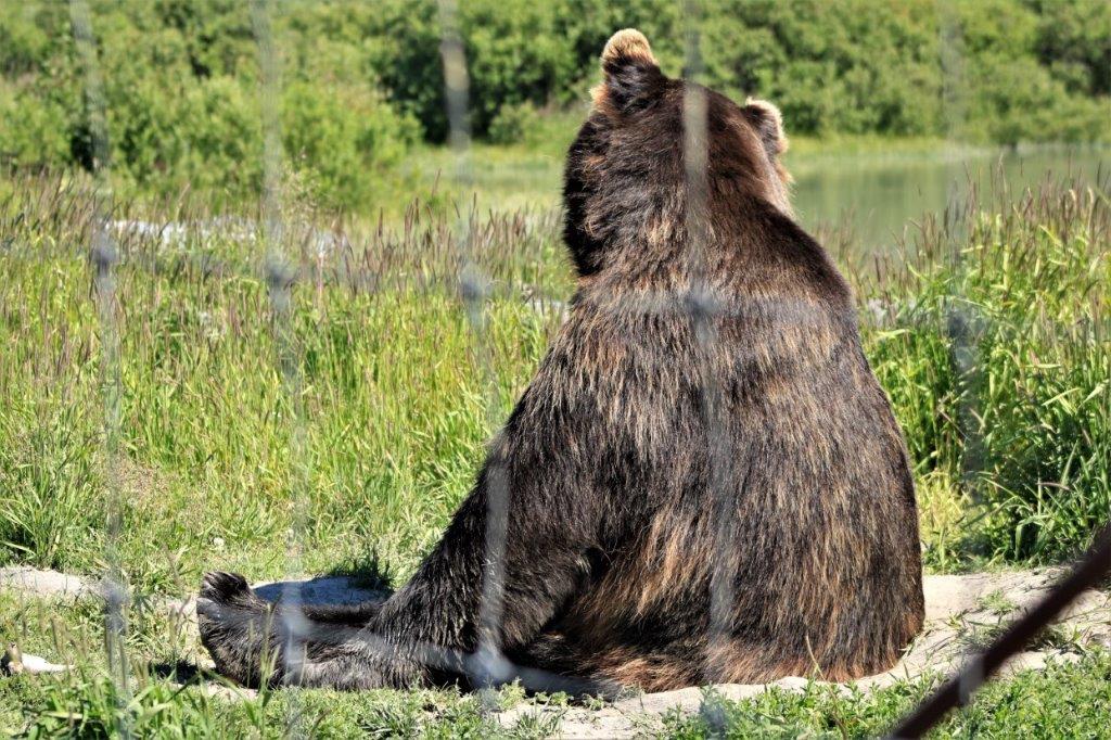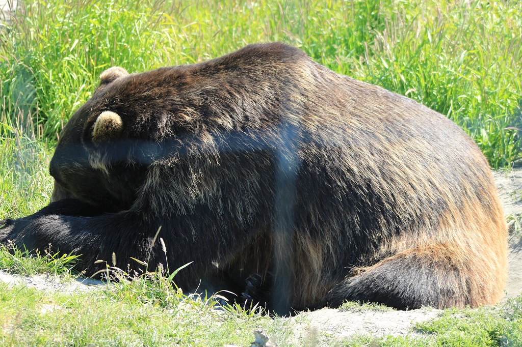 There were two Grizzly’s (or brown bears as they seem to prefer to call them up here) in the enclosure. The big male, JB was having a nap right by the fence. The female was off on the other side of the lake doing her own thing.