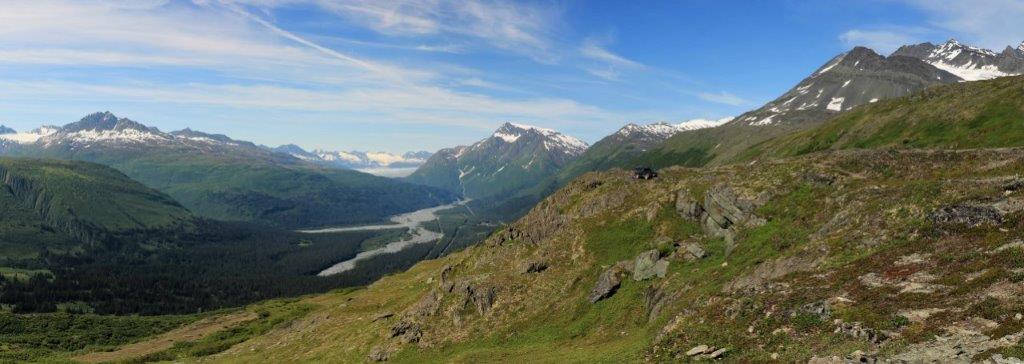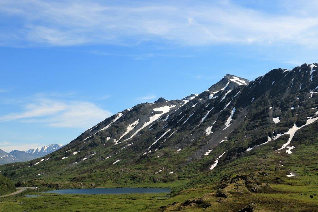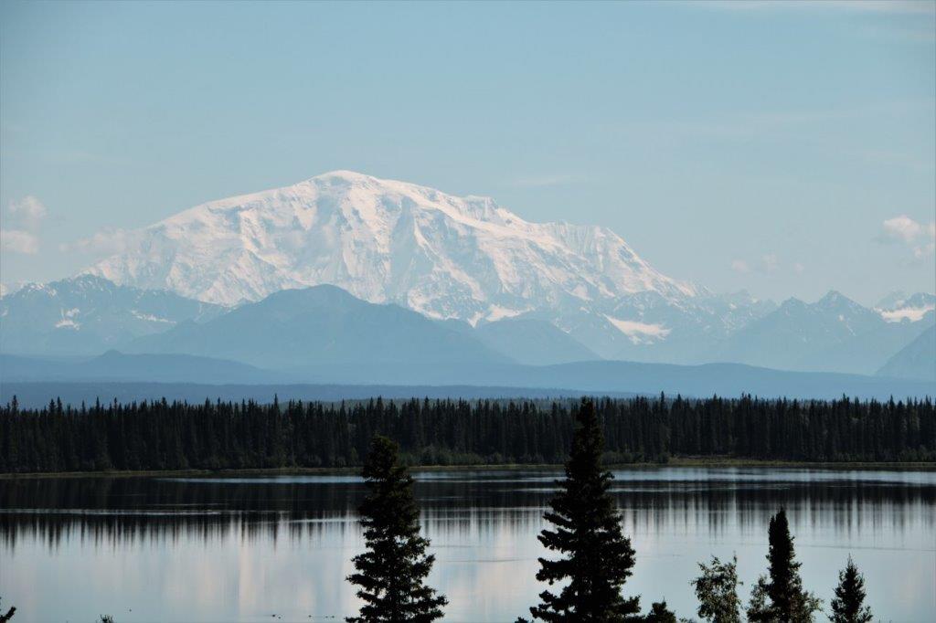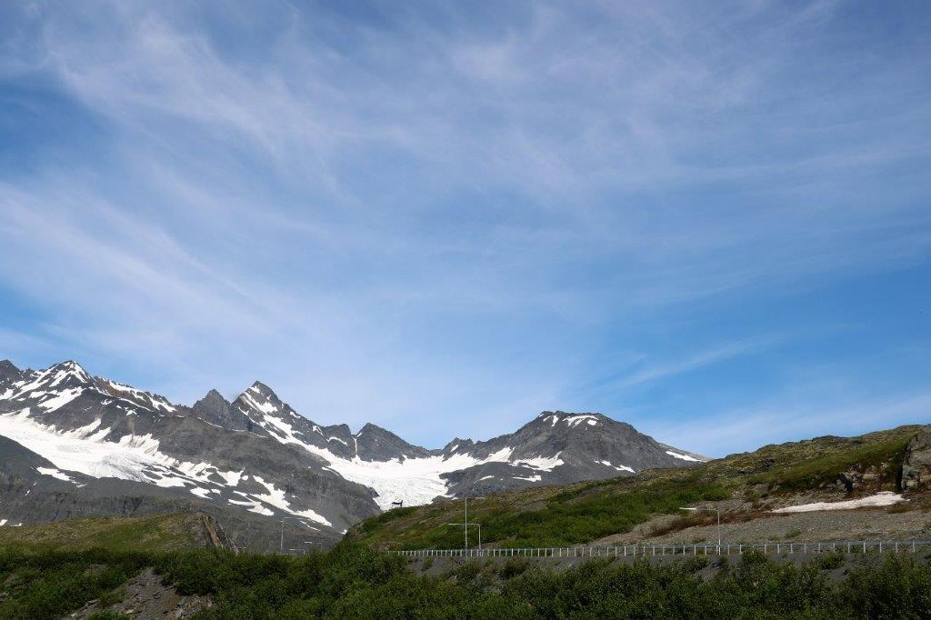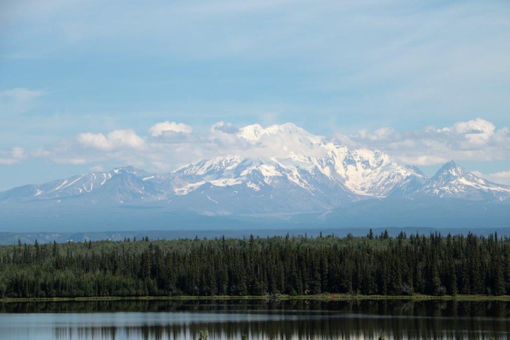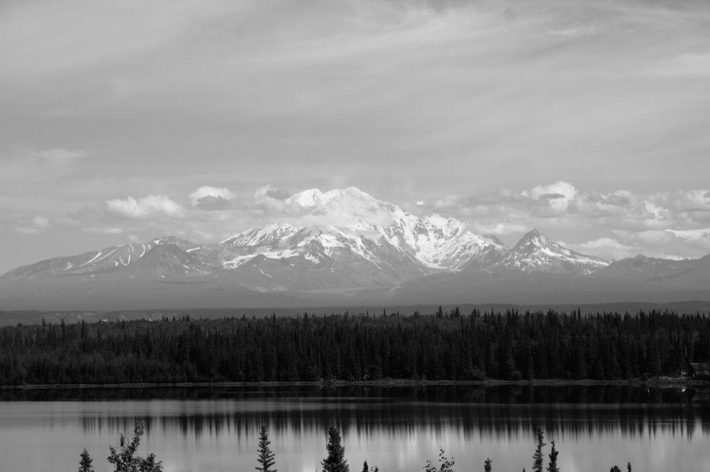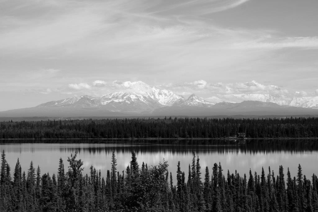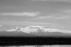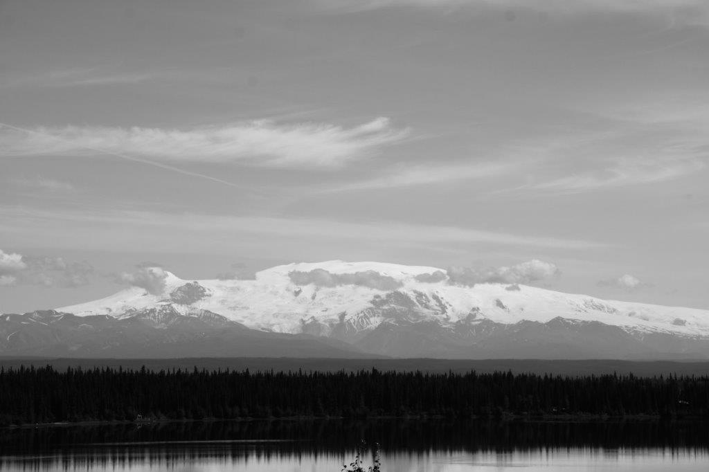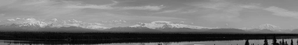 We passed Willow Lake again and the four mountains of the Wrangell Range were mostly out of the clouds. The distance between the mountains is quite long so the a stitched photo is pretty thin.