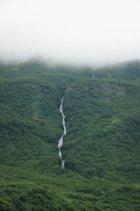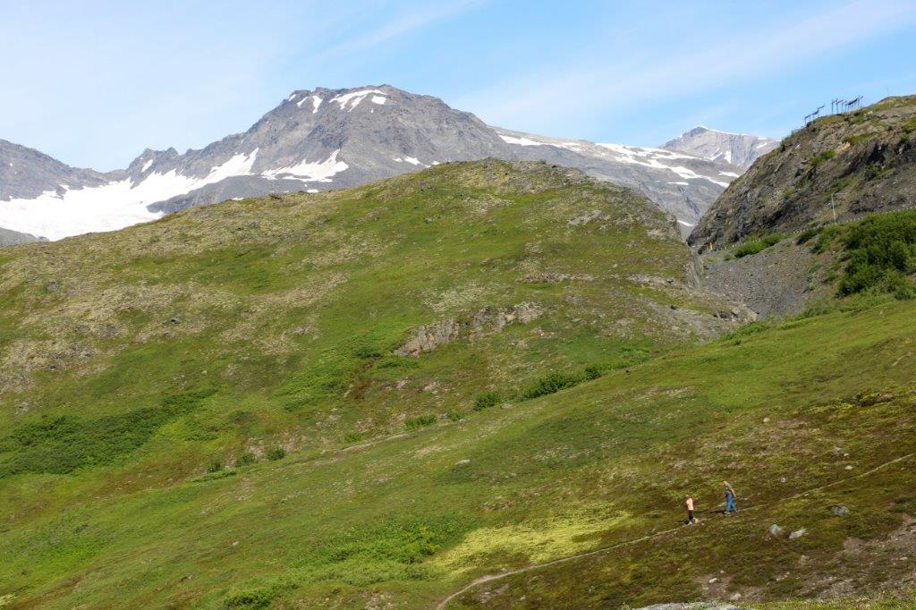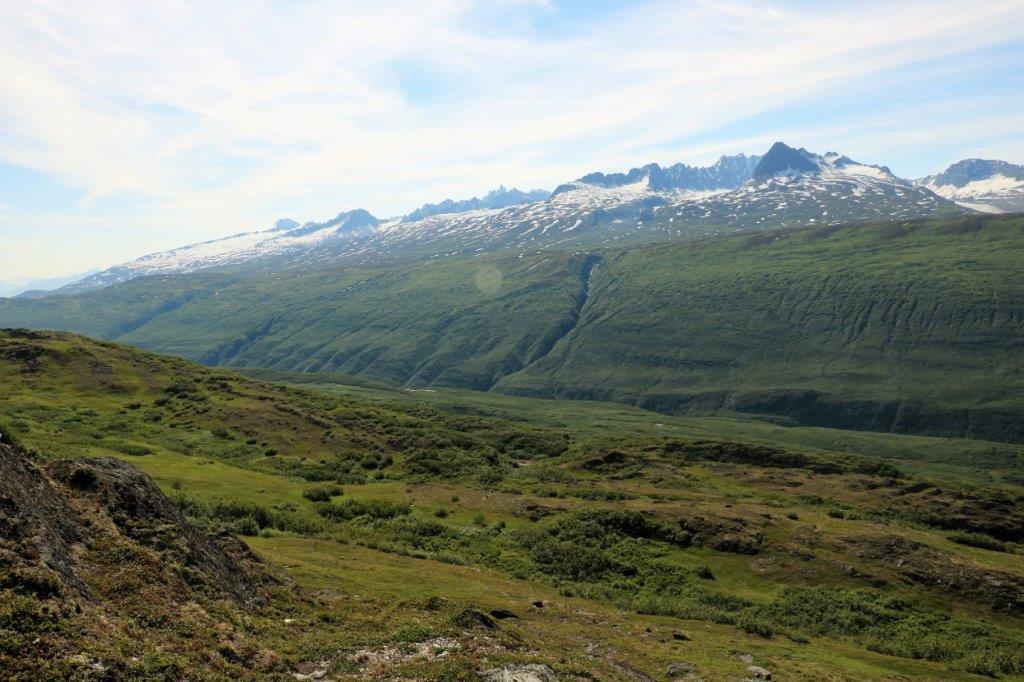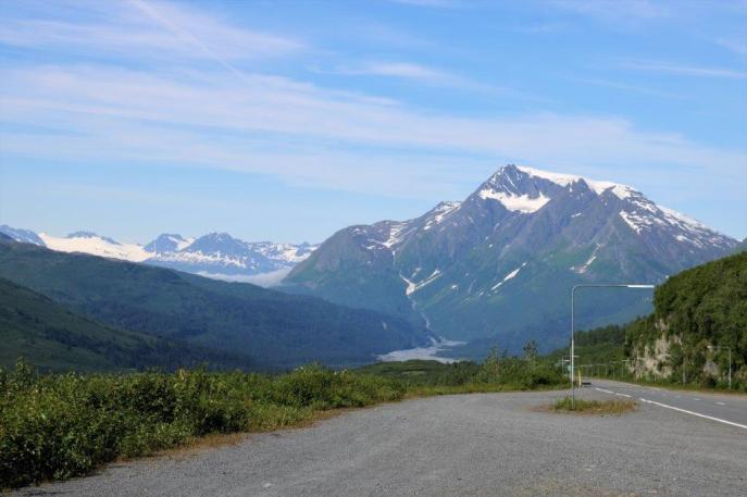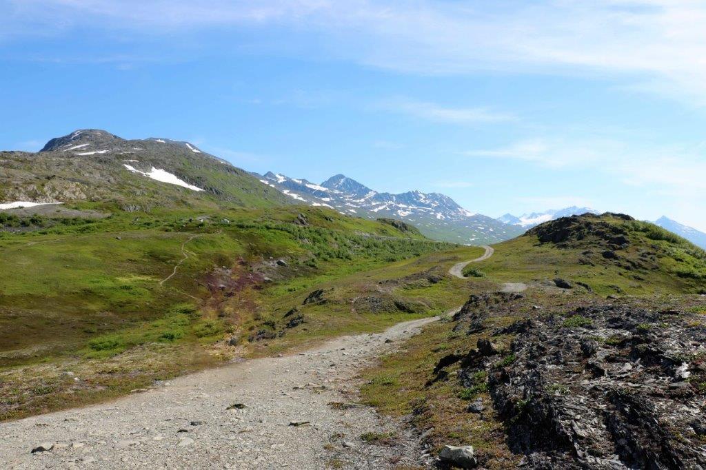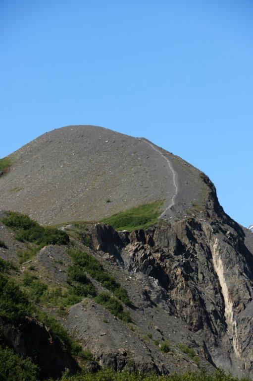 When we drove into Valdez yesterday I noticed this incredible view far down a valley on a path below a viewpoint. It was getting late and we had driven a long while so we decided we leave the hike until the return trip providing the weather was still good. We estimated it would take a half hour or so each way. However, today, I could not face making such a hike. John noticed that there was a ‘trail’ that branched off before the view pullout and there were vehicles driving it. It was pretty rugged, with big rocks and potholes to navigate, but John loves the challenge of that sort of thing and we have a 4×4, so off we went.