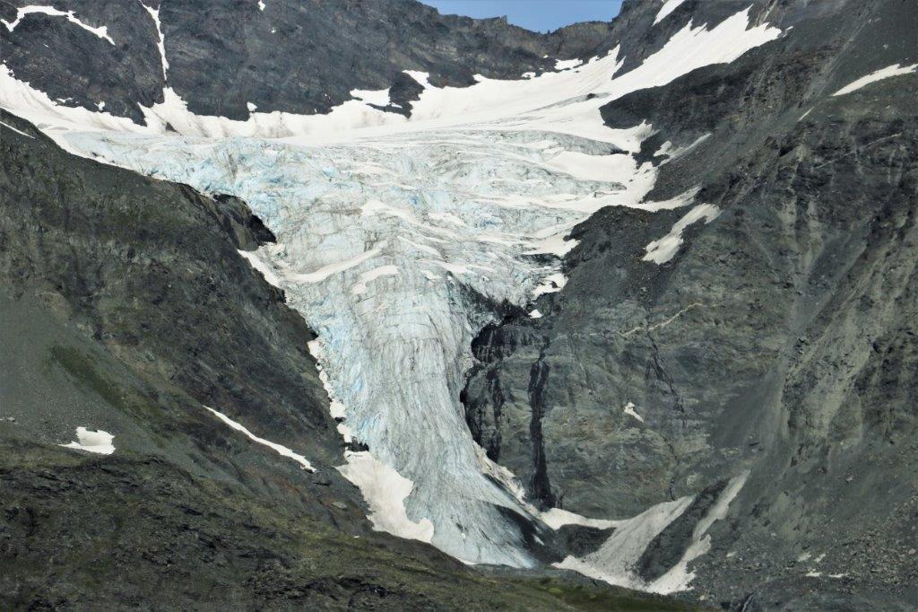 These three folks climbed up almost to the top point of the lighter gravel above them. From what anyone could see using the telescopes, one of them may have had hiking boots on and was carrying a walking stick. We think the other two were just in running shoes. Near the top of the lighter gray gravel section they started to go across the glacier, but the surface was so slippery, the one in the red jacket could get no traction and was very timorously inching along. After awhile, thankfully, they started to come back down. And, me, being me, was thinking, “These people are idiots. If one of them falls and slips the others have no way to assist. None of them had proper equipment and glaciers are known to crack at any time.” Several people were watching them and all of us were shaking our heads. I don’t understand why so many people do so many things that are so stupid! But, as they say, there is no cure for stupidity. That’s all I’m sayin.’ I have no problem with folks doing adventurous or dangerous things as long as they know what they are doing and are properly equipped for the task. (And so says, the woman, who as a child climbed out the attic window of her parents house and sat on the roof to read, and climbed to the top of a 50′ fir tree and did her homework. But…I was a really good tree climber back then!)
