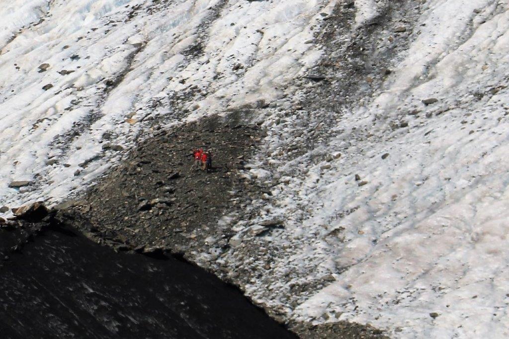 The ridge line on the photo on the left is a trail that people have made walking up to see the glacier from a higher perspective. In the photo on the right, if you look at it full screen, you can see a small group of people near the dark spot at the bottom of the glacier. The photo below is a close crop to pick them out better.