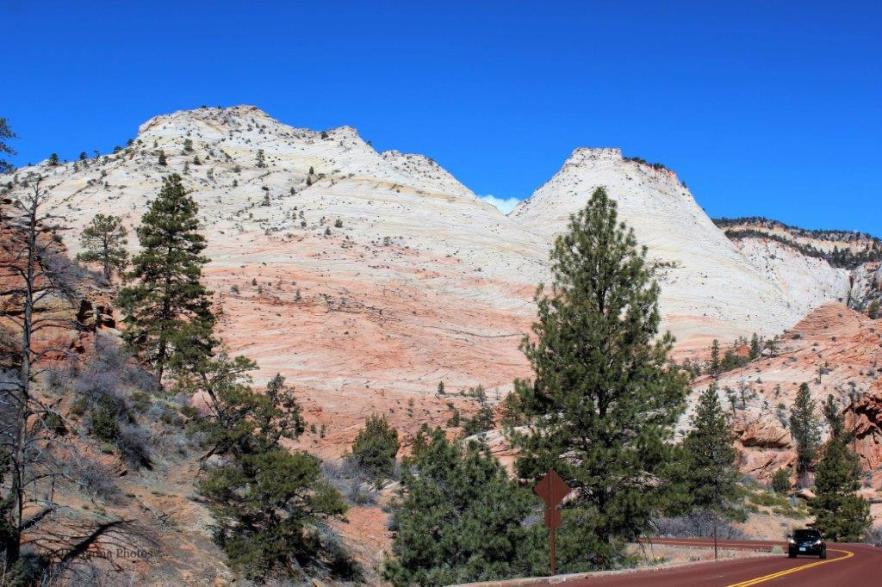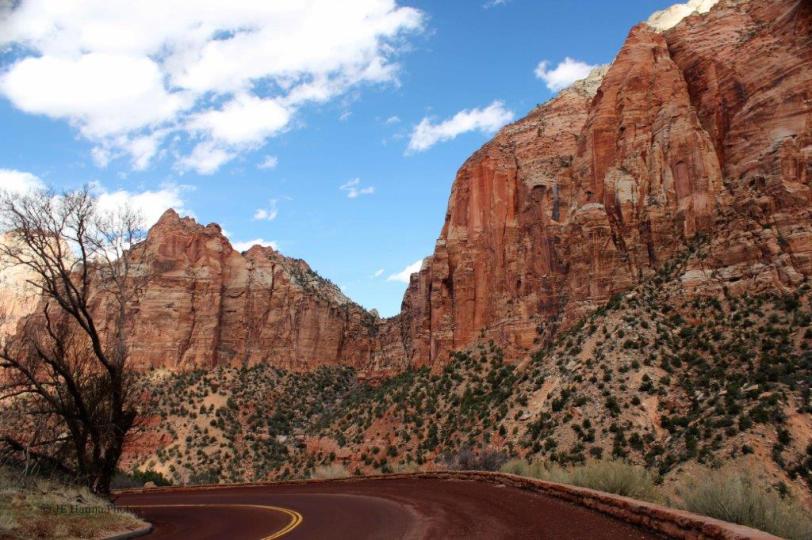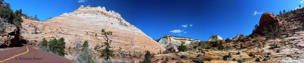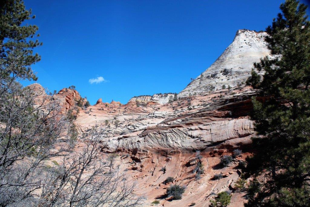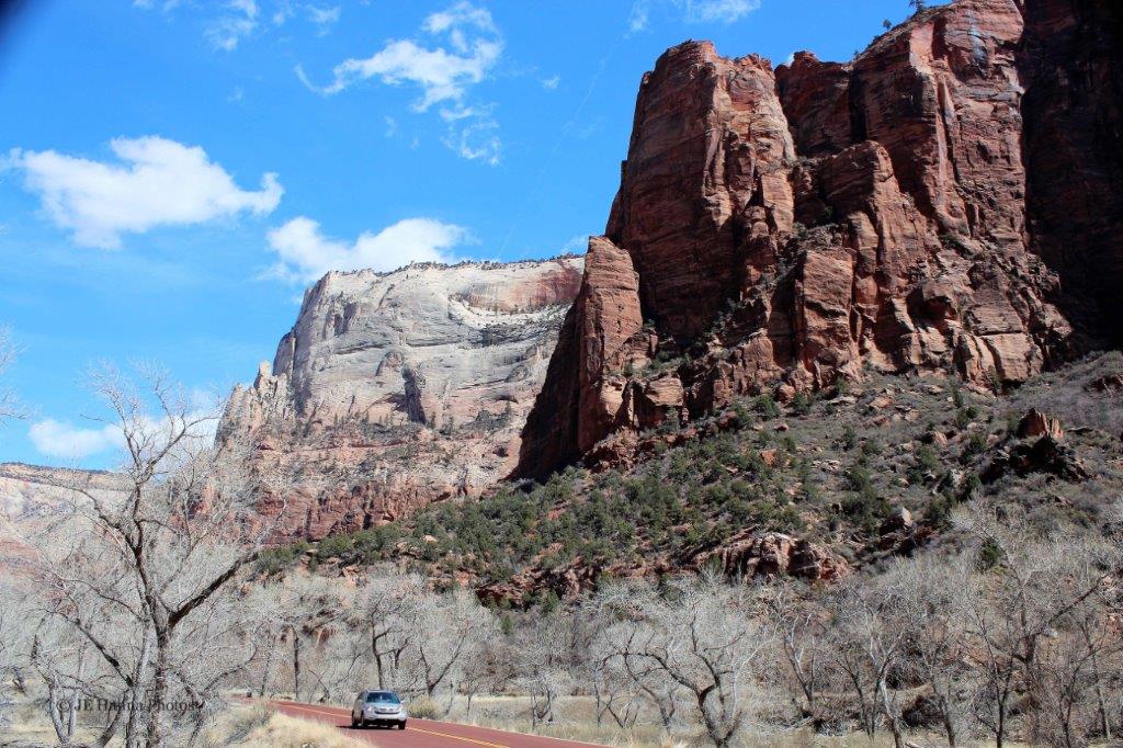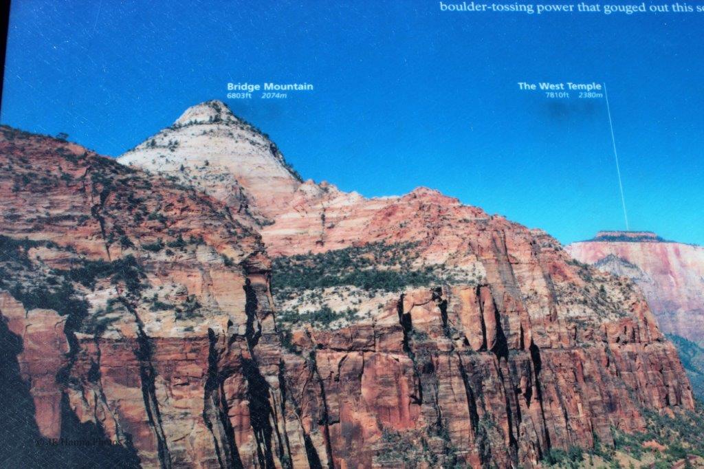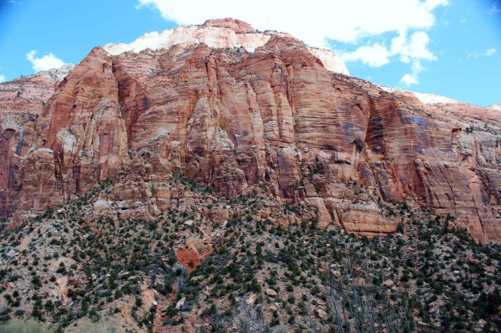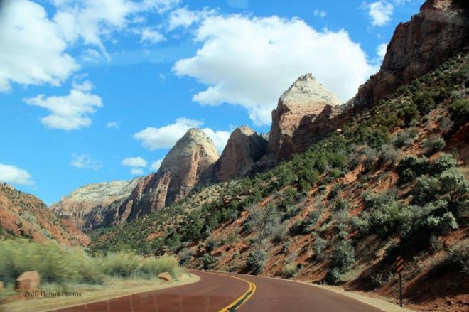 Not long after we crossed the boundary into Zion National Park in southwest Utah, I realized I had a problem. Every turn in the road, every twist of the head would bring into focus another amazingly colourful rock bluff or hill; or an interestingly-shaped stone pillar. Within a mile or so of our drive through the park I had taken dozens of photos. Now, in the age of digital imagery this is not a major problem, since you don’t have to pay to get them printed, but it did create a great deal of photos to go through and choose what to keep. This too, is not a big problem if you are at home with all the time in the world to go through them, but back in 2013 I was not writing a blog, I was posting each day’s photos on Photobucket in the evenings for family and friends at home. Which, with hundreds of photos to go through in the hotel each evening made for some late nights, or skipped uploads. Not a big deal except for my CDO tendencies.