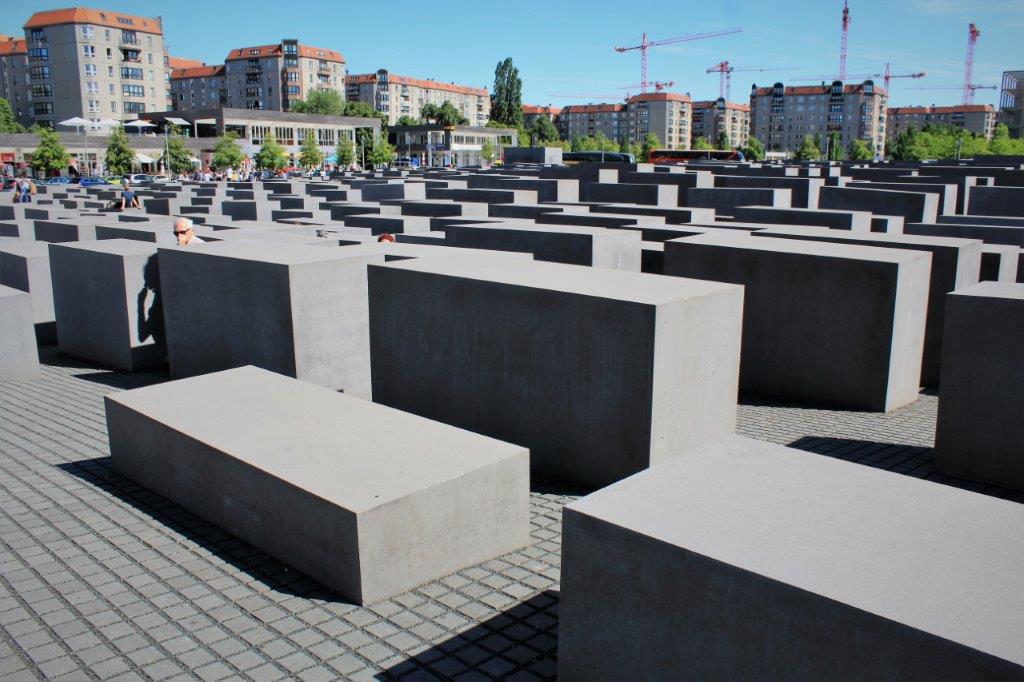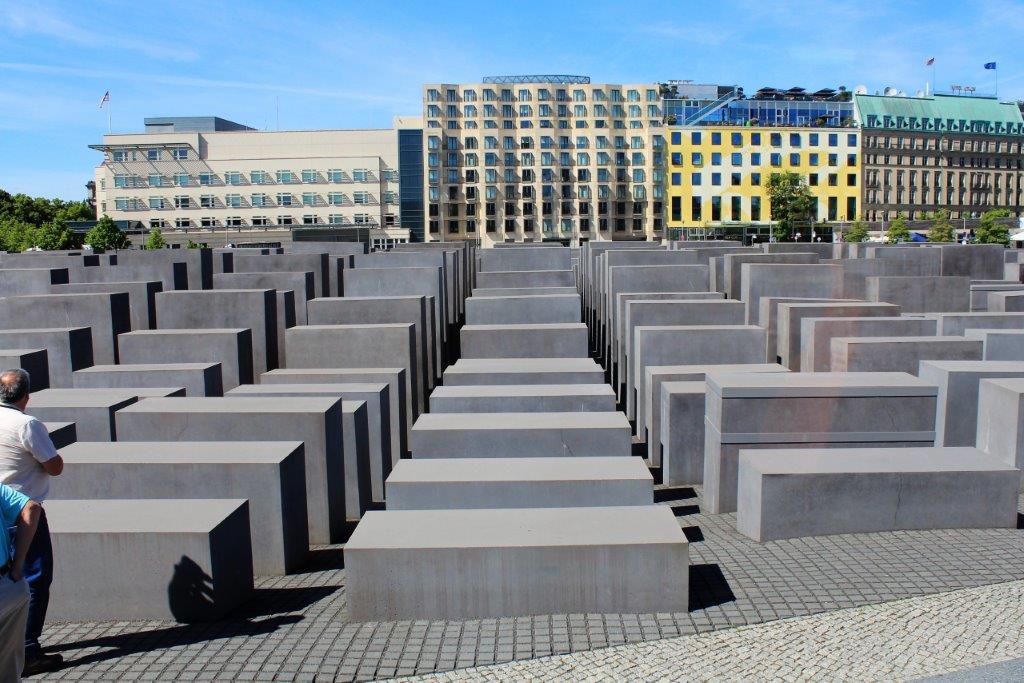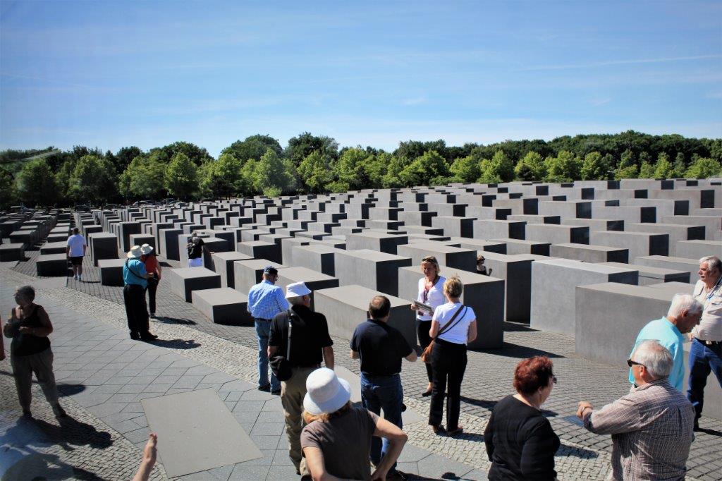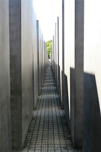 From the site of the former Berlin Wall we were driven to the Holocaust Memorial. This huge sculpture in the middle of Berlin commemorates the millions of Jews who were executed by the Nazi’s during World War II. It is constructed on part of the Death Strip of the Berlin Wall in an area that housed many former administration buildings of the Third Reich. The official name is the Memorial to the Murdered Jews of Europe and it covers 4.7 acres (19,000m²). I found the image below on the internet which gives an idea of the size. We, obviously, only wandered amid a small portion.