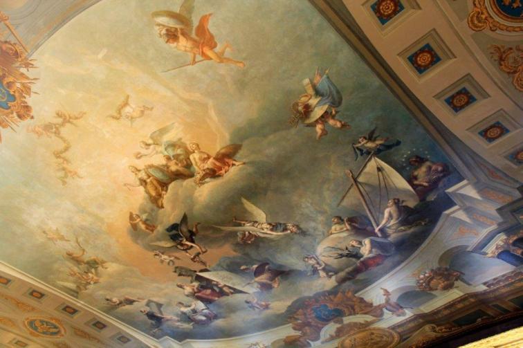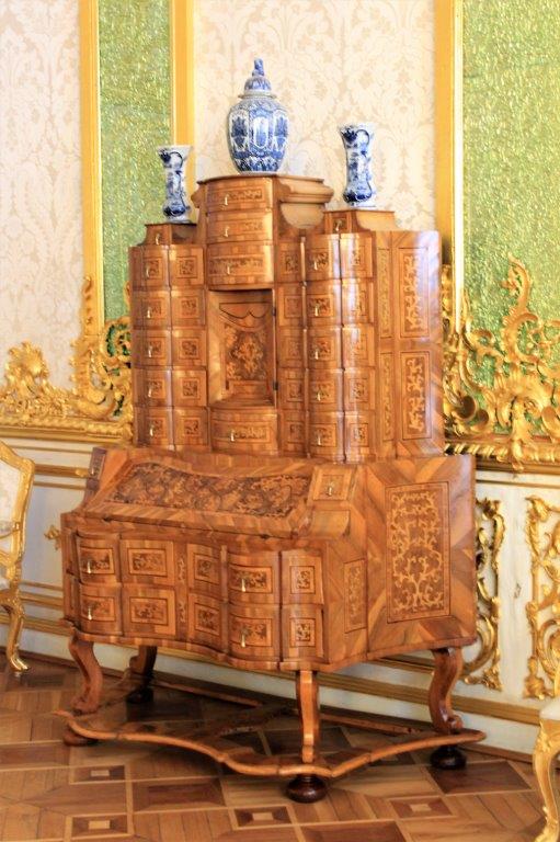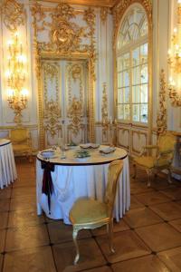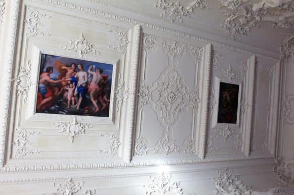 The magnificent Grand Hall is over 154′ long and 56′ wide (47m X 17m) and has a beautiful parquet floor and elaborately painted ceiling. Between the light coming in from the windows and all the mirrors the room fairly sparkles.
