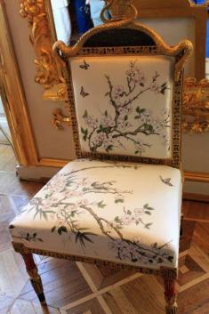 Each chair is a different pattern of hand-painted silk.