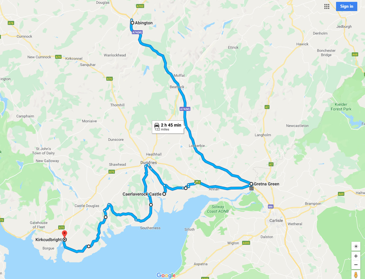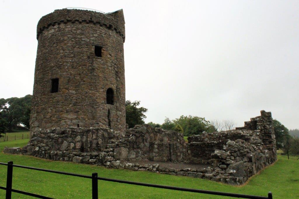 From Caerlaverock Castle we followed the road northwest along the east side of River Nith, crossed the river and skirted under the major city of Dumfries, then continued southward back toward the Solway Firth. Orchardton Tower is located about 4 km (15 miles) east of Kirkcudbright.