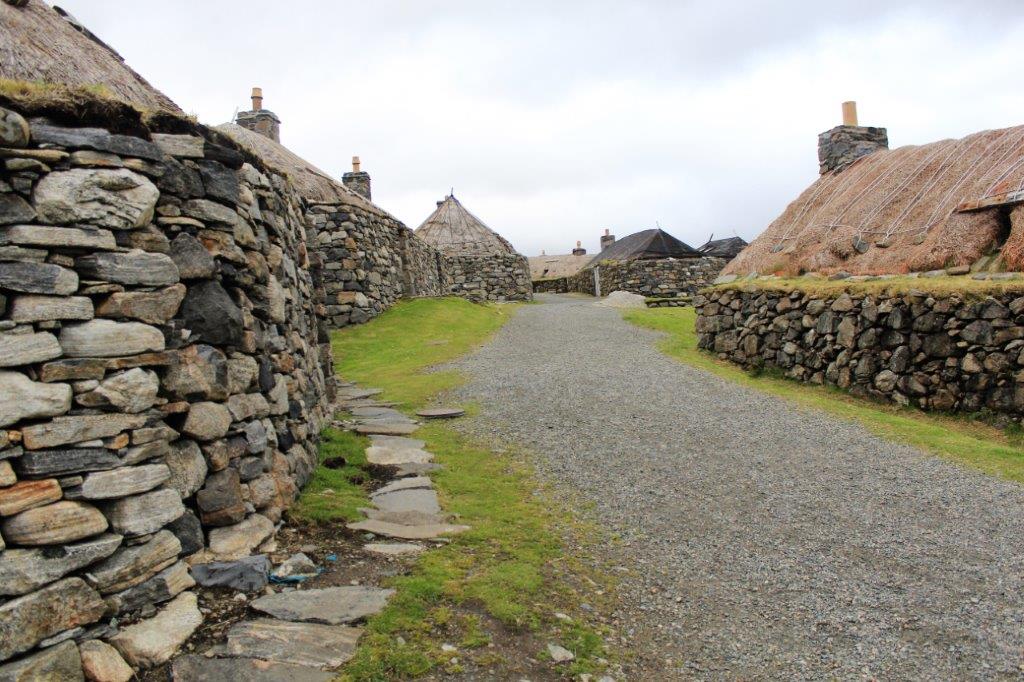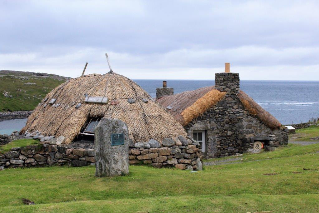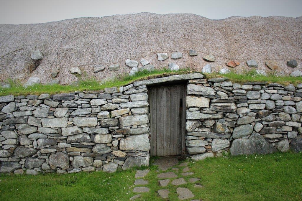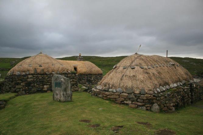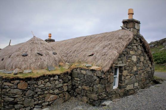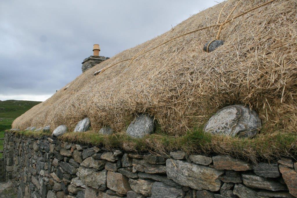 The Blackhouse was a residence for both animals and humans. There was no chimney and a peat fire was lit at all times in the center of the kitchen and living area. The dwellings had thick stone walls and thatch-covered roofs. Looking at the Blackhouse from the outside it is long and narrow, and its main feature is a thatched roof made of twigs and heather and overlaid with straw. The building is constructed from local stones with no cement between the stones. The thick stone walls and earthen floor absorbed the heat of the fire. The earth core of the walls was good for insulation and also served to keep out draughts, and the chilly winds. The turf and thick thatch, heavy with soot, were also good insulators.