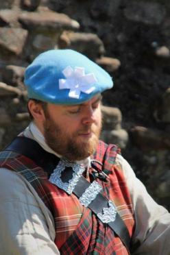 The white ribbon – cockade – on his hat would let people know he was a supporter of Bonny Prince Charlie, the exiled heir to the Scottish throne; whose attempt to regain his place resulted in the disastrous Battle of Culloden that was a crushing defeat for the Scottish Clans.