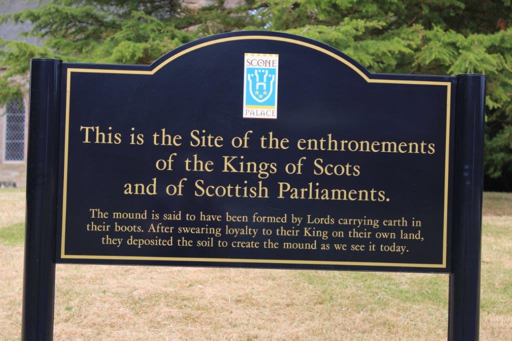 From 1114 to 1559, Scone was one of Scotland’s major monasteries and later abbeys. All that remains today is the small Presbyterian chapel atop Moot Hill, which in reality is just a slightly higher piece of land across from the main palace grounds