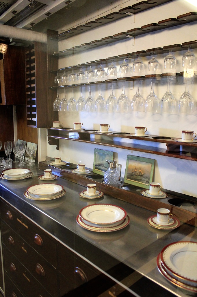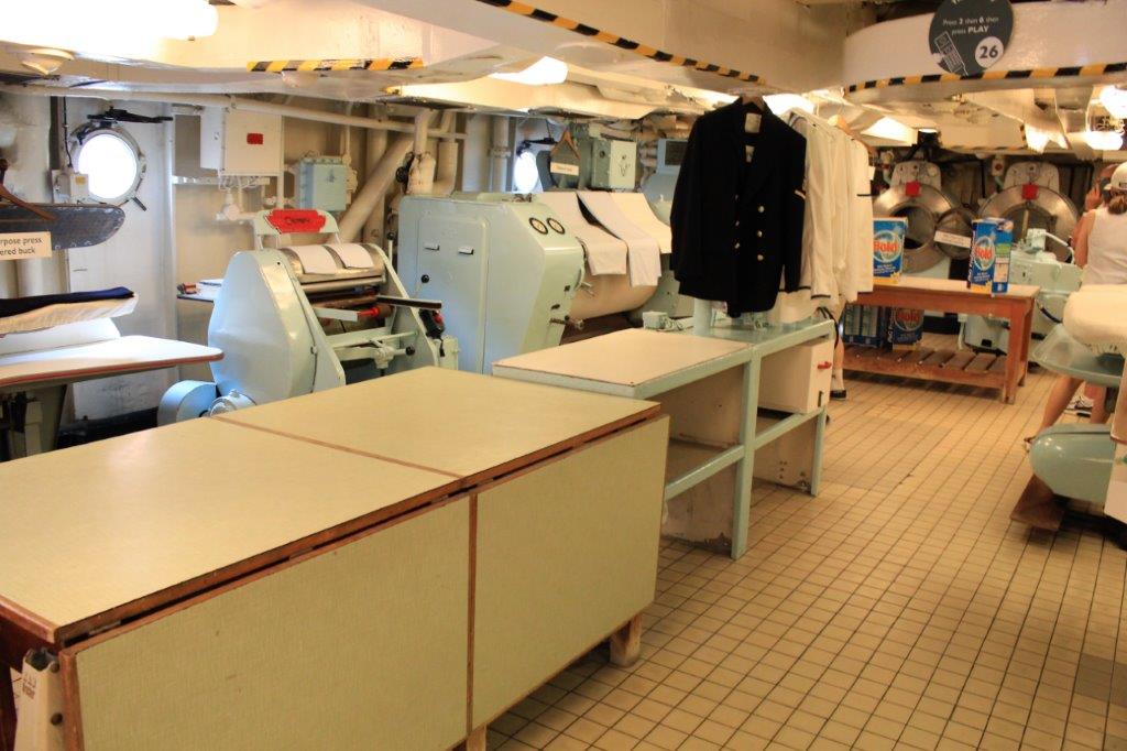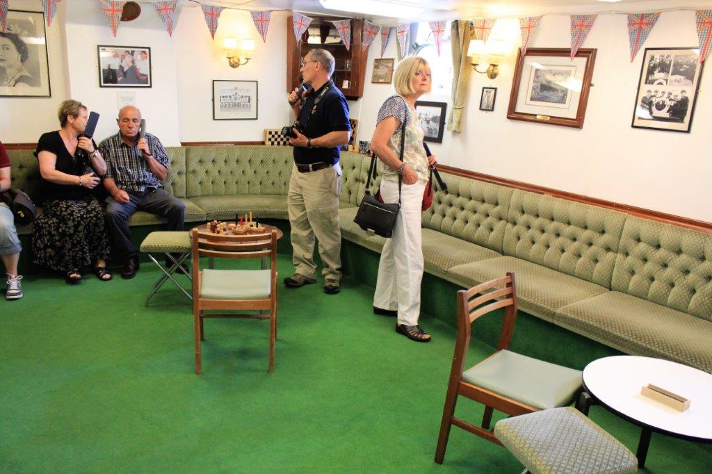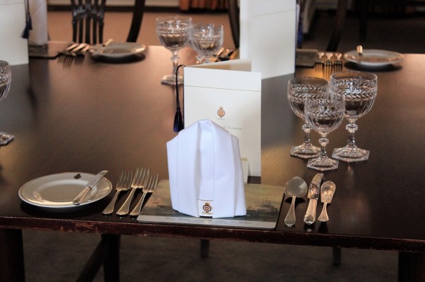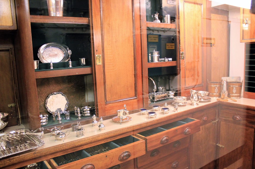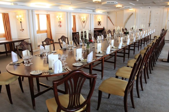 The Ward Room – the mess cabin for commissioned officers. Officers serving on the Britannia were chosen from the ranks of the Royal Navy and served two-year terms. The crew were all volunteers from within the Royal Navy. After serving 365 days you could be admitted to “The Permanent Royal Yacht Service” as Royal Yachtsmen and then served until you chose to leave or were dismissed for medical or disciplinary reasons. As a result, some crew served for 20 years or more. The ship also carried a troop of Royal Marines when members of the Royal Family were on board.