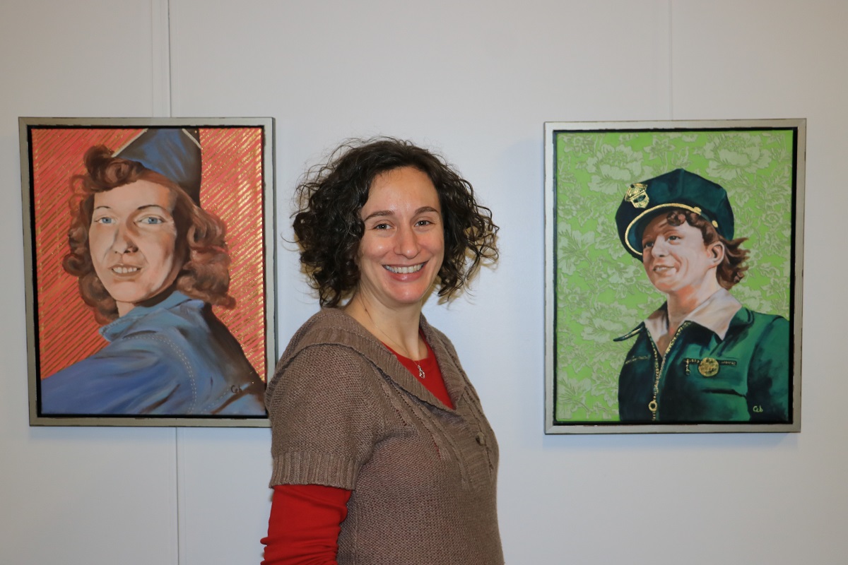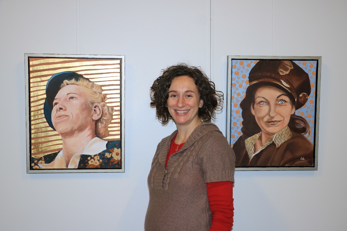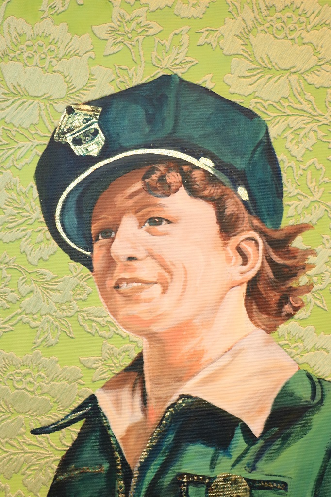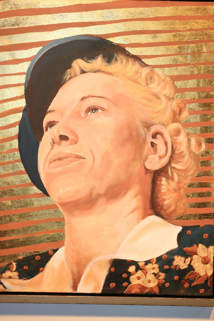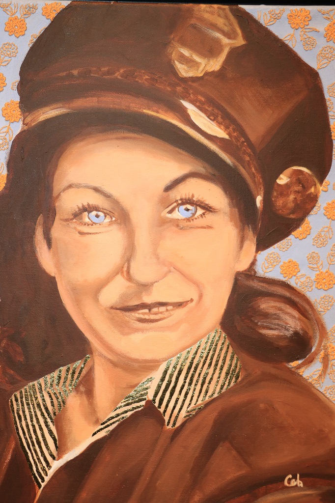Carrie’s series is called “Anonymous Woman” She had been inspired a few years ago by a series of black and white portraits of women from the 1940’s that she saw in the US National Archives. The women were photographed because they were doing traditionally male jobs since the men were off at war. There were five cabbies and two photographers. None of the women were named. Carrie wanted to honour these women and began her art series. The paintings are acrylic on canvas and linen, but she also incorporated ‘feminine’ highlights of embroidery and gold leaf.