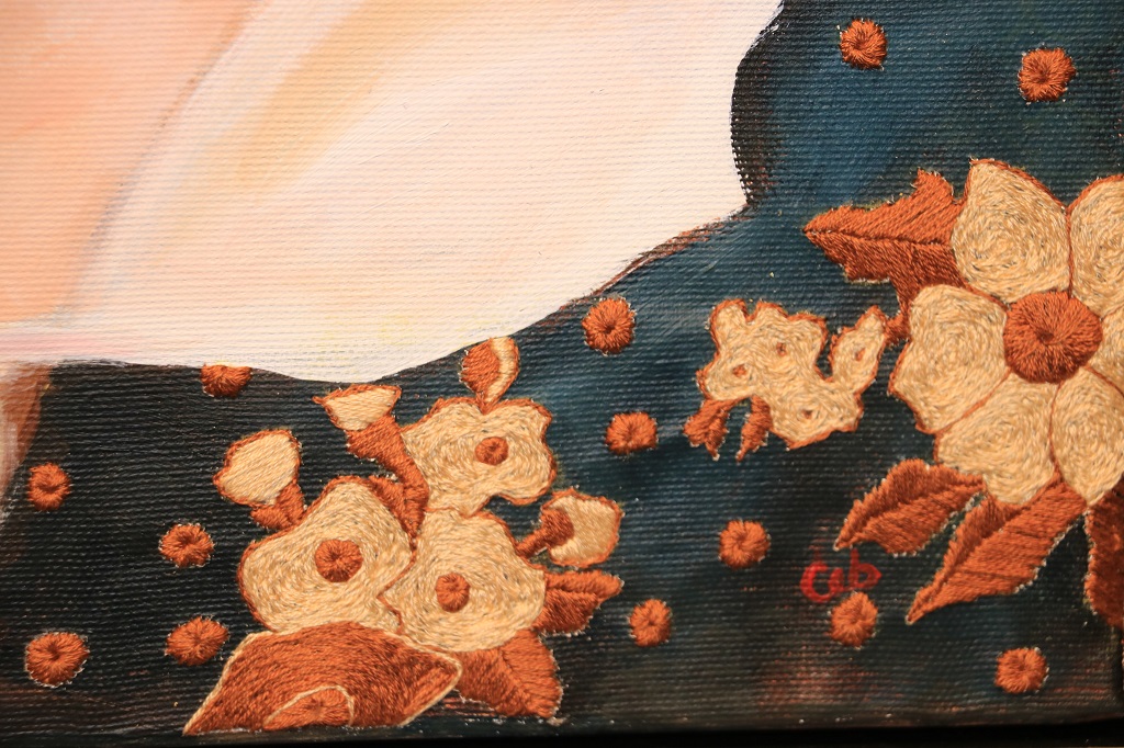 “Barbara” has over 200 hours of satin stitch emboirdery in the background wallpaper. “Ruth” has a gold leaf striped background plus emboidery on her jacket.