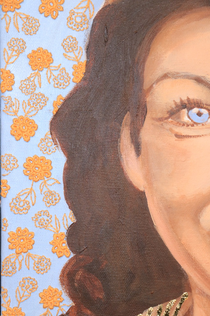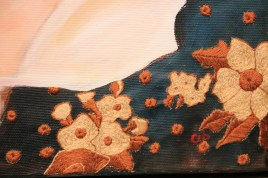 Carrie researched period wallpaper patterns so the background of each portrait would be correct. “Dot’s” floral pattern is also embroidered and her shirt collar is gold leaf.