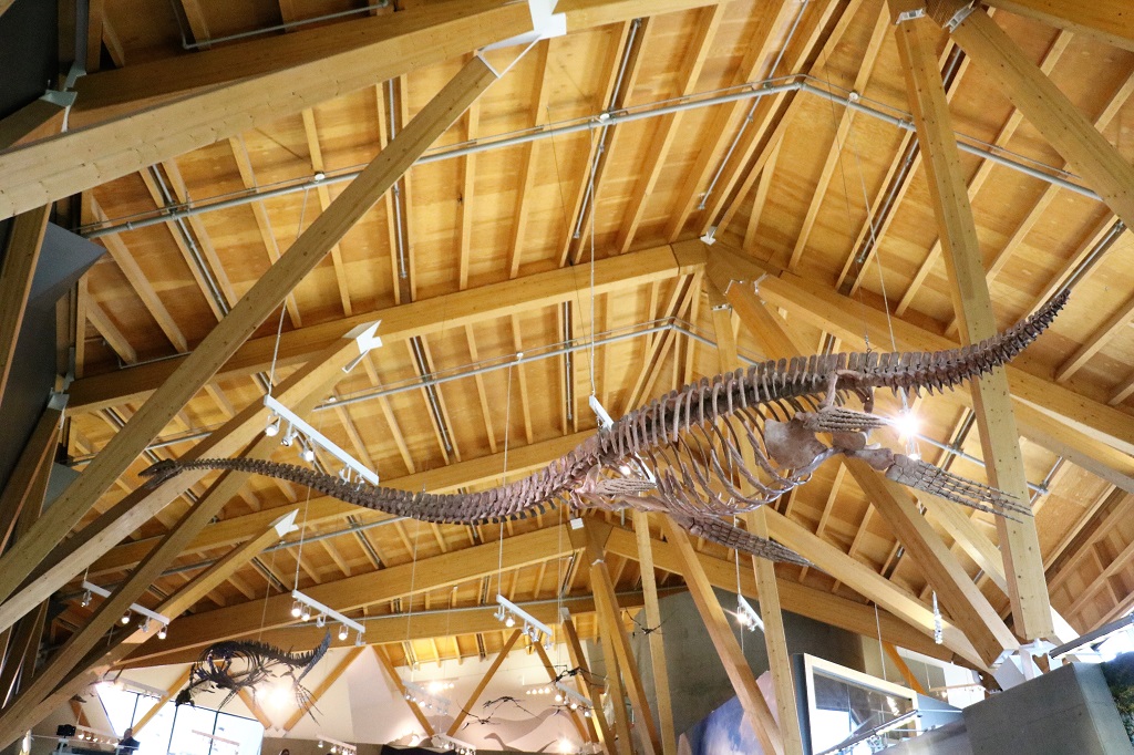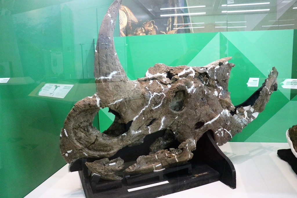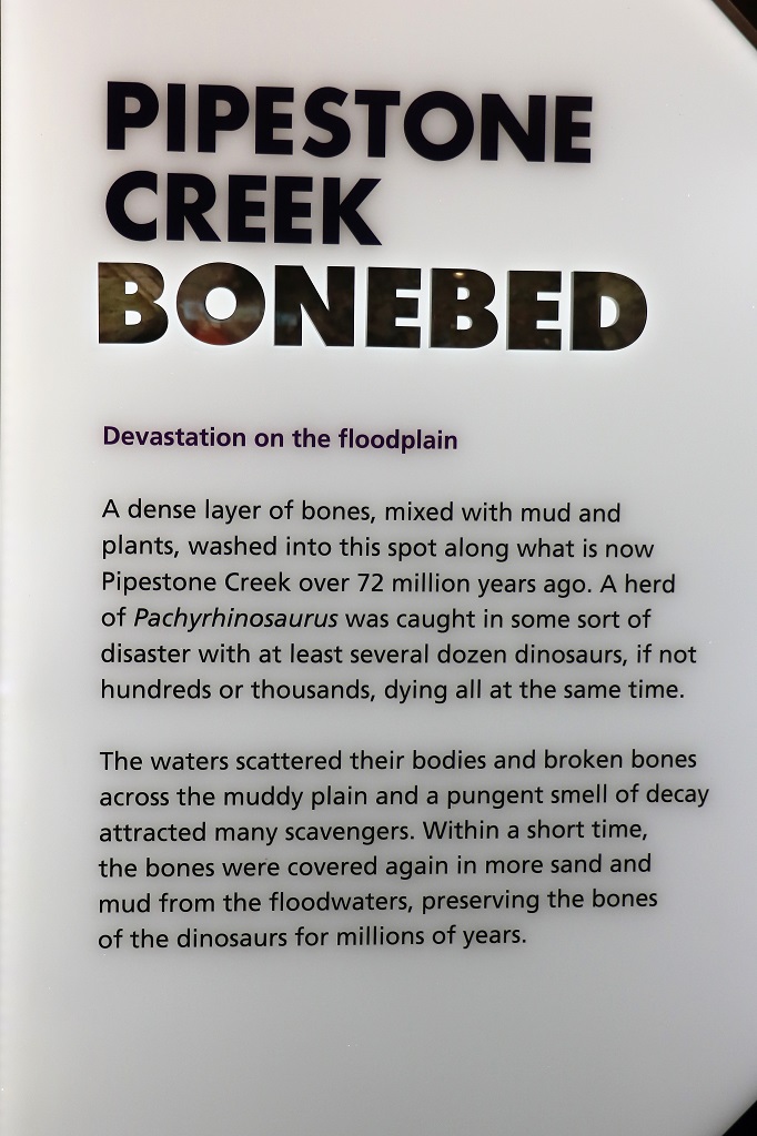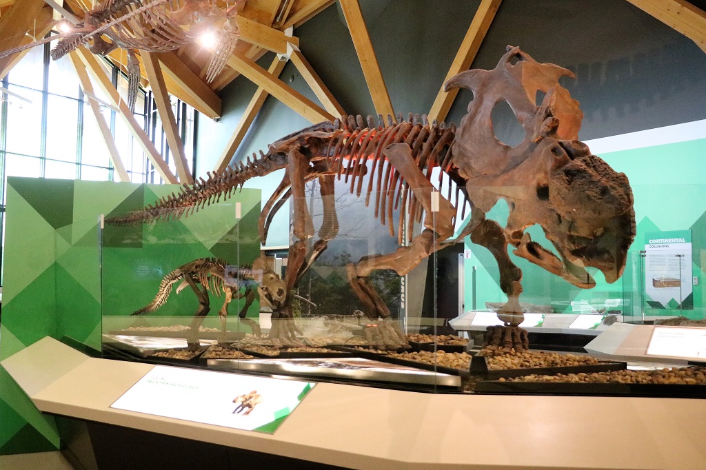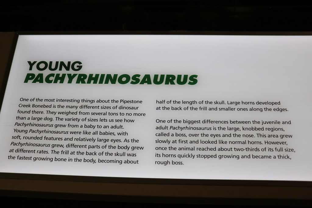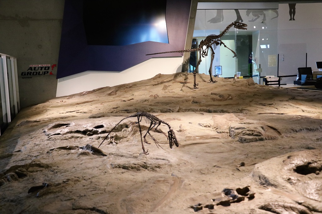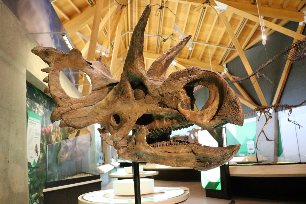 First discovered in 1974 by a local high school teacher along the Pipestone Creek, the finding of this horned dinosaur, Pachyrhinosaurus Lakustai, was so significant it led to the creation of the musuem, which opened in 2015 near the community of Wembley. The Pipestone Creek bonebed is one of the densest mass fossil sites in the world. The size of a football field, hundreds of dinosaurs were frozen in time here. With the sheer size and scale of fossils the creek was nicknamed the River of Death.