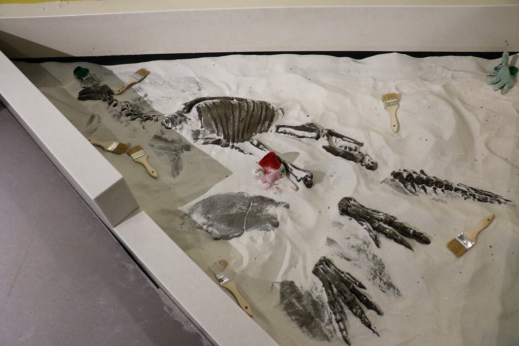 There were two sand pits like this where kids (or adults) could use the brushes to expose the fossils. In reality the paleontologists use jackhammers, rock picks, and hammers and chisels to remove the bones.