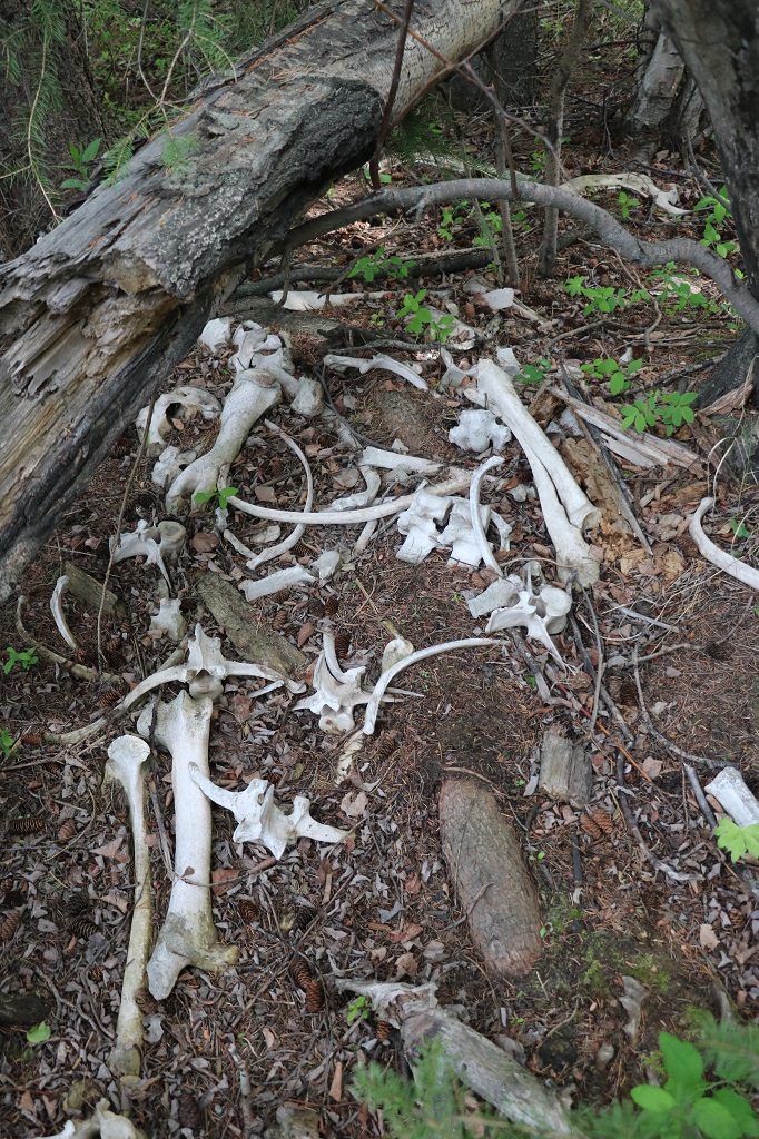 We went into the bush to find a geocache and I discovered a bonebed. Well not a dinosaur bonebed but the remains of some large animal, perhaps an elk or moose.
