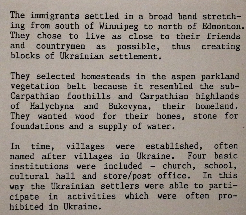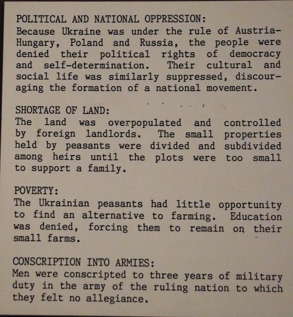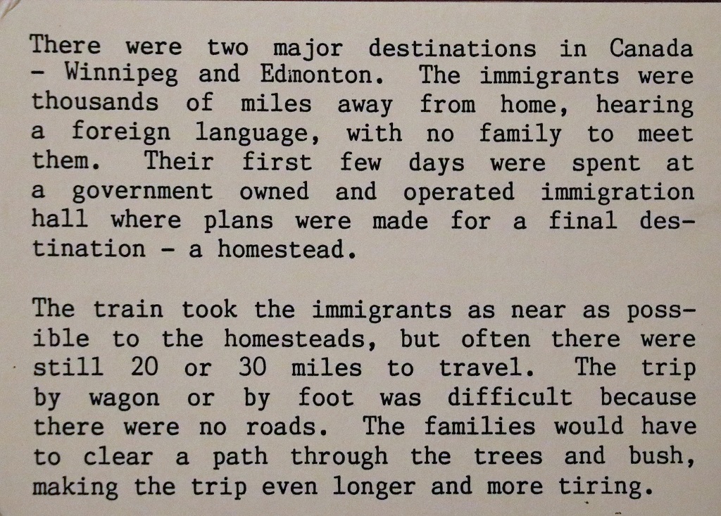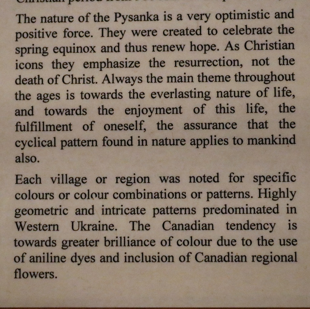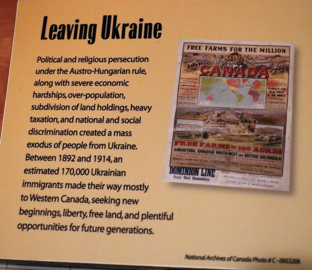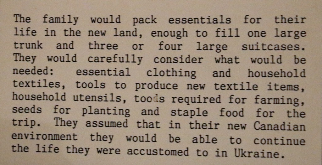 The third, and largest room, displayed gorgeous clothing, woodwork, carpets, Easter eggs (Pysanka) and other items made by some of the local or pioneer Ukrainian people. There were also a series of cards that told the immigrant story. I am only inserting the seven that tell the basics of the story for all the new immigants that came to Canada between 1892 and 1914.