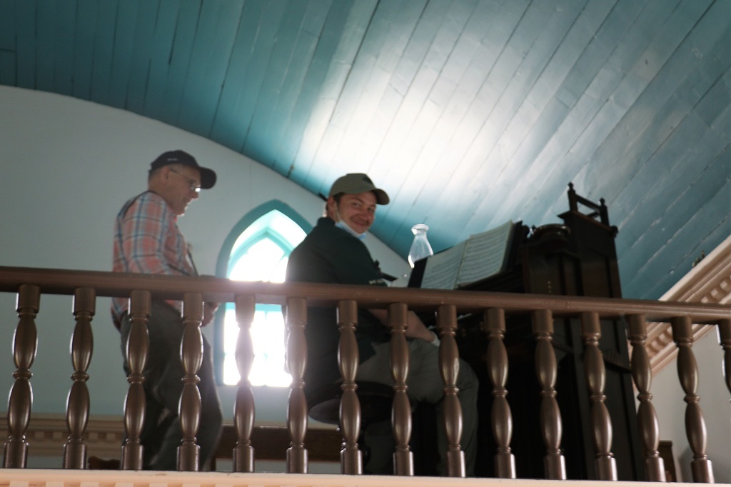 In 1996 Parks Canada located and purchased the original Harmonium that was in the choir loft and had it returned to the church. It had been purchased years ago at a cost of $50. A harmonium is a reed organ with sound produced by foot bellows. There are no pipes; pitch is determined by the size of the reed. The young Parks Canada fellow were were chatting with took John up and struck a few notes on it. He cannot play the piano but he was tickled to play the harmonium. John took a turn as well. The instrument is played regularly to keep the reeds from drying out and shrinking.