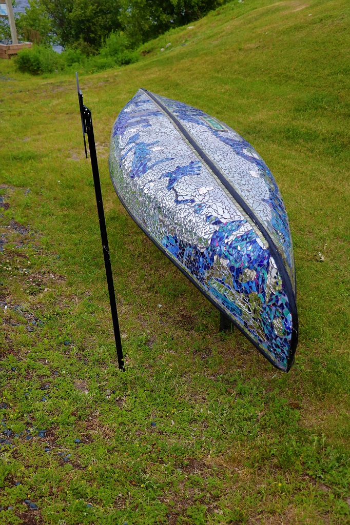 This lovely glass ceramic canoe was on the lawn at the Kenora Visitor’s Center. The plaque says, “The canoe reflects the Path of the Paddle Waterway Trail from Wabigoon Lake (Dryden), through Eagle Lake (Vermillian Bay), Winnage & Teggau Lake systems to Dogtooth Lake (Rushing River Provincial Park), Lake of the Woods (Kenora), and Winnipeg River to the trail end at Whiteshell Provincial Park.
