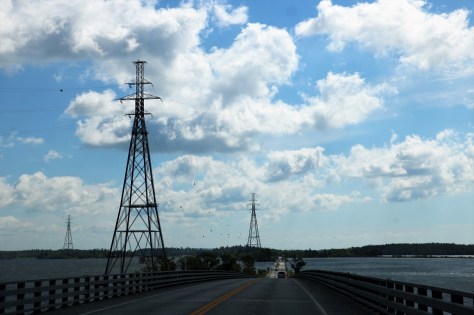 As expected, again, we drove past more rocks, trees, and water. The area surrounding Fort Frances is dotted with little islands and inlets and the Rainy Lake extends for miles. The lake covers 360 square miles and straddles the border between the USA and Canada. There are numerous bridges that connect islands to make the highway. This was the longest one.
