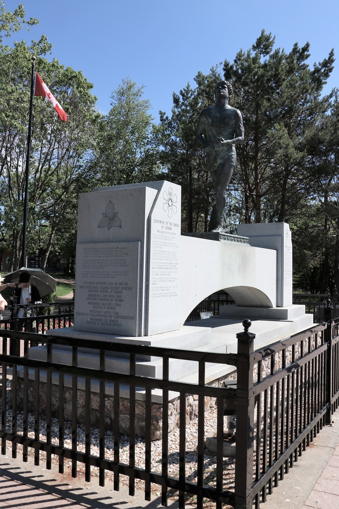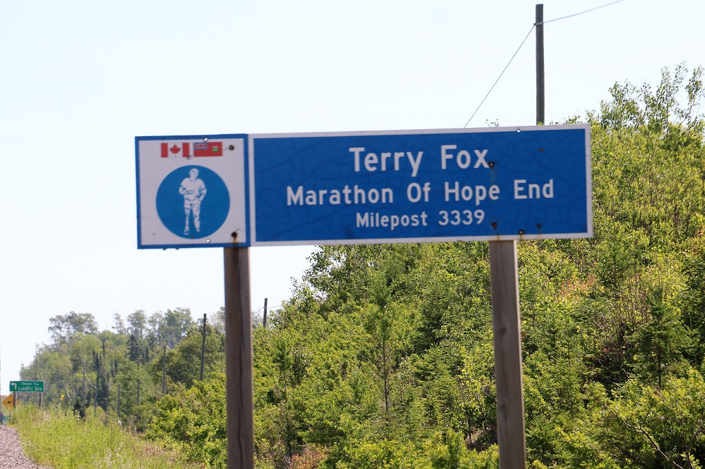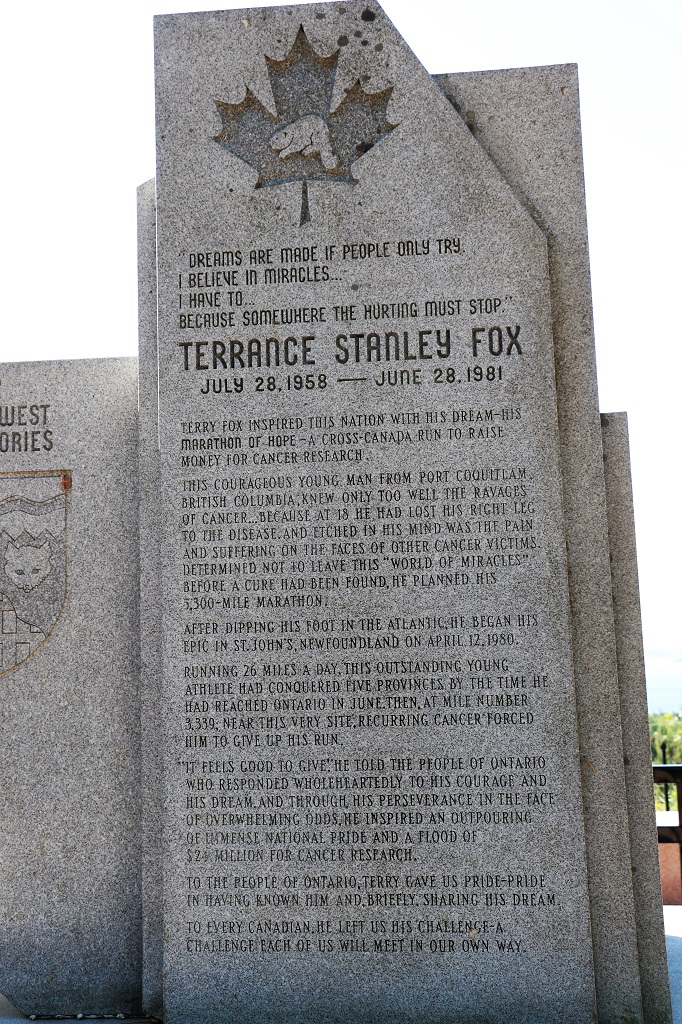 A few kilometers up the road from the memorial is a marker to commemorate where Terry had to stop his Marathon of Hope due to the pain from his recurred cancer. His plan was to run the 5300 km across Canada – from Atlantic to Pacific – but he had to stop at mile 3339.