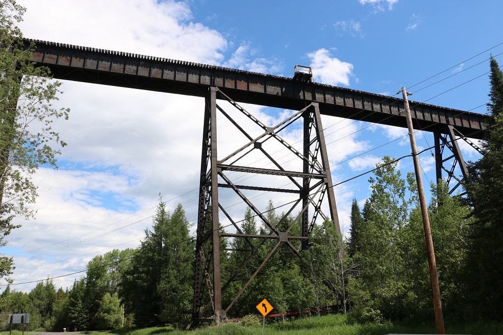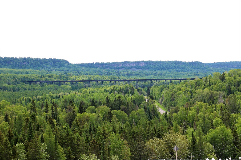 As we drove down the Sibley Peninsula we stopped to try find a geocache hidden at one of the bases of this massive railway viaduct. It was officially the Blende River Viaduct, but is locally called the Pass Lake Trestle. It was built in 1916 by the Canadian National Railway as part of the southern rail line around Lake Superior. The tallest part is 140′ above the ground and it is 2280′ long. It has not been used for quite a few years and there is now a movment to have it turned into a trail and added to the Trans-Canada Trail network.