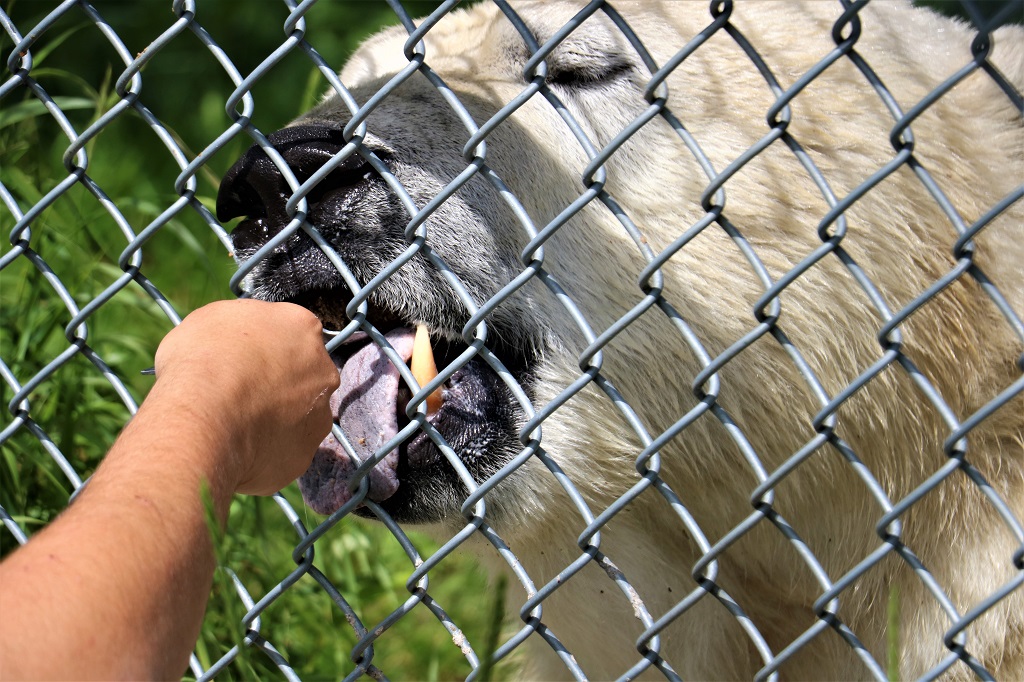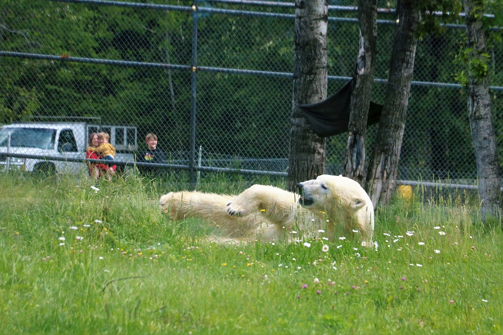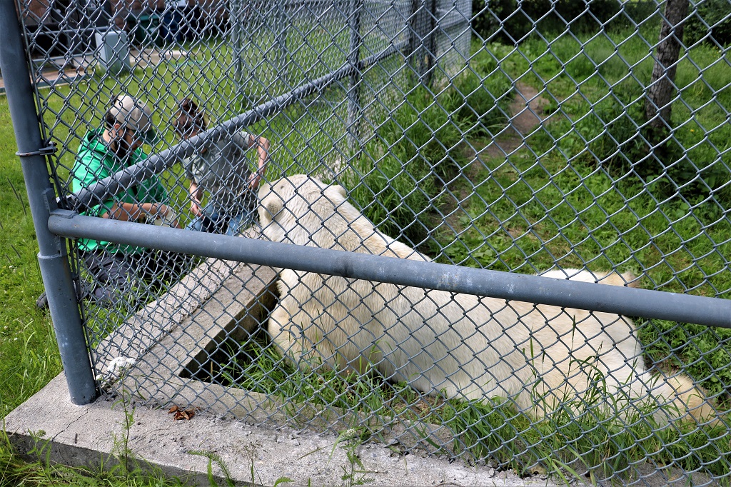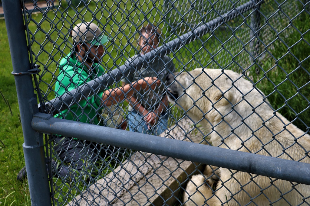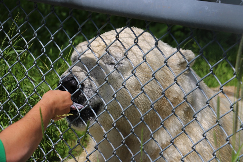 Inukshuk was getting his pre-dinner dry food mixture that is specifically made for polar bears. He took every mouthful of the spoon so very gently. They get fed moose meat, seal meat, this kibble mix and fruits and vegetables. They get the fruit and veg mainly in the summer to give them food that does not contribute a lot to their weight so they can manage the heat better. They love watermelon.