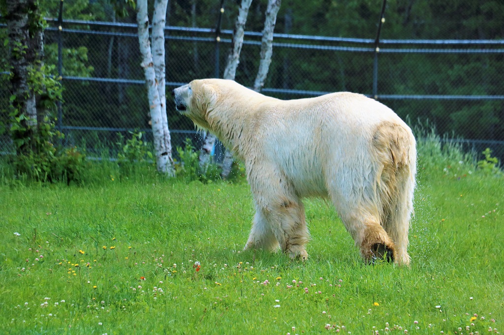 This is Ganuk. He just came out of the pool in his enclosure and is soaking wet. He walked into the grass and had a good long roll to help dry off.