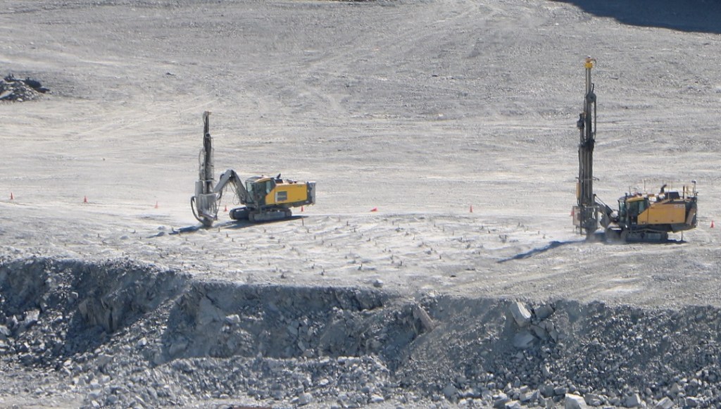 This is a photo John took and cropped in close. There are four of these machines drilling holes along this section for dynamite charges. They are all the little sticks you can see in the neat rows. When they get all the charges in place they will blow it all at once.