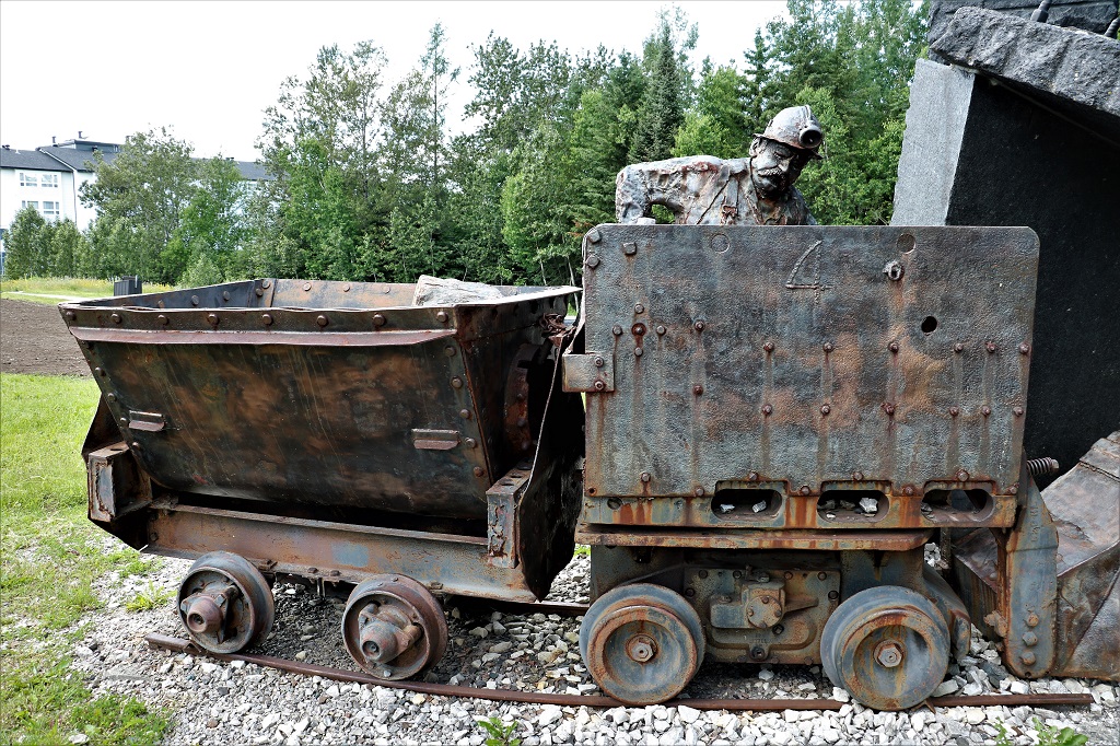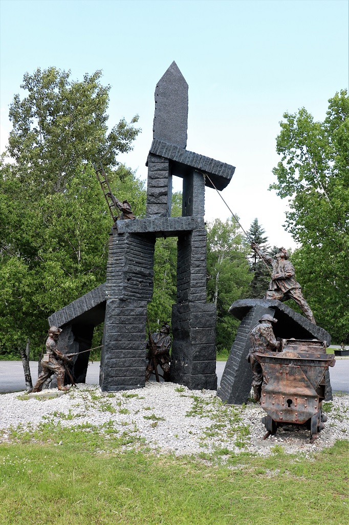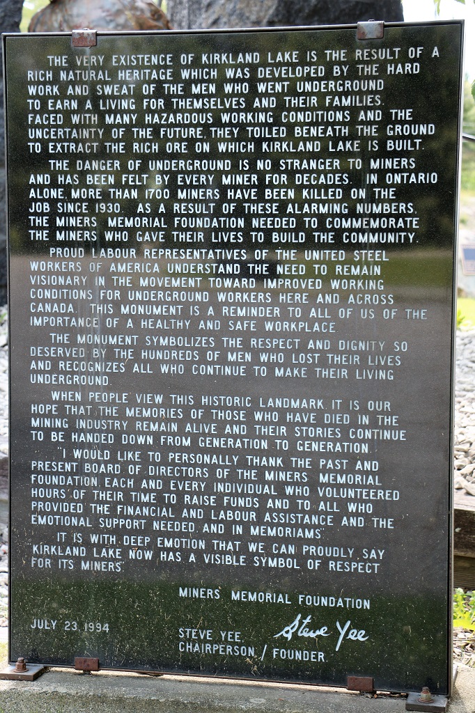 Beside the memorial was a life-size statue of miners at work. The equipment being ‘used’,the mucker machine, even the battery packs on the miners are original and were donated by local miners. The sculpture weighs 40 metric tonne and is made of 10 meter high black granite and bronze. It was completed in 1994 for Kirkland Lake’s 75th anniversary.