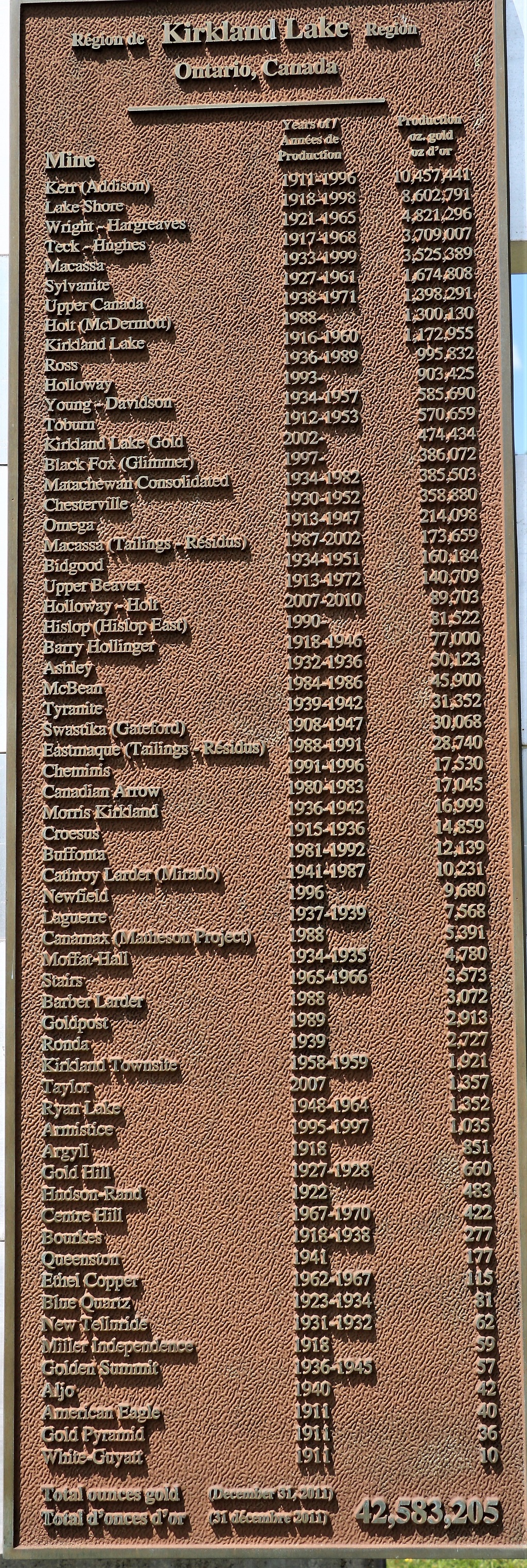 The Miners Memorial at Kirkland Lake. The earliest deaths recorded are in 1917 and the latest was 2005.