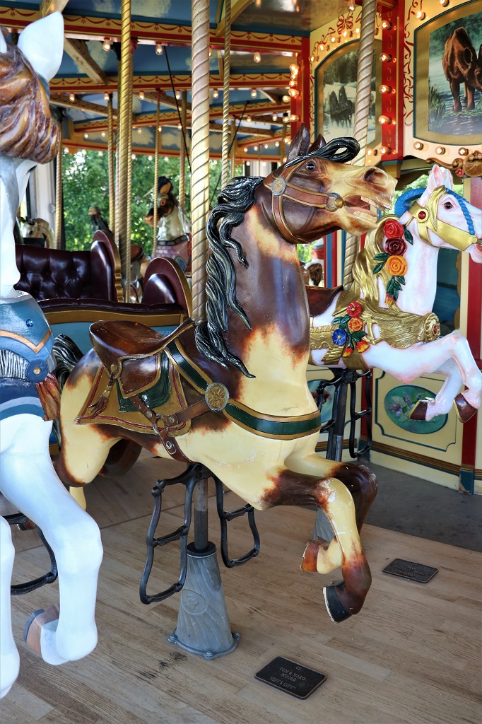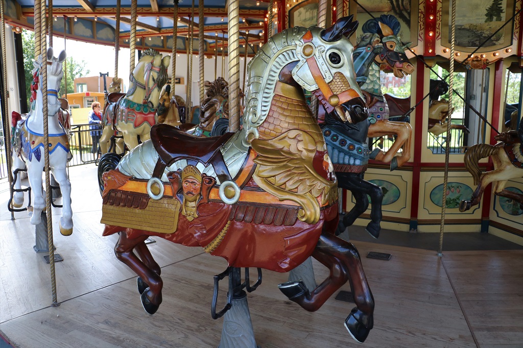 Local carvers made, and local artists painted, all the horses on the carousel. When they had finished this one they started on a smaller one that is made of northern Canada animals. It was not open and operating but there were pictures of all the animals they had made. Moose, fox, lynx, deer, elk, raccoon, etc. They were adorable.