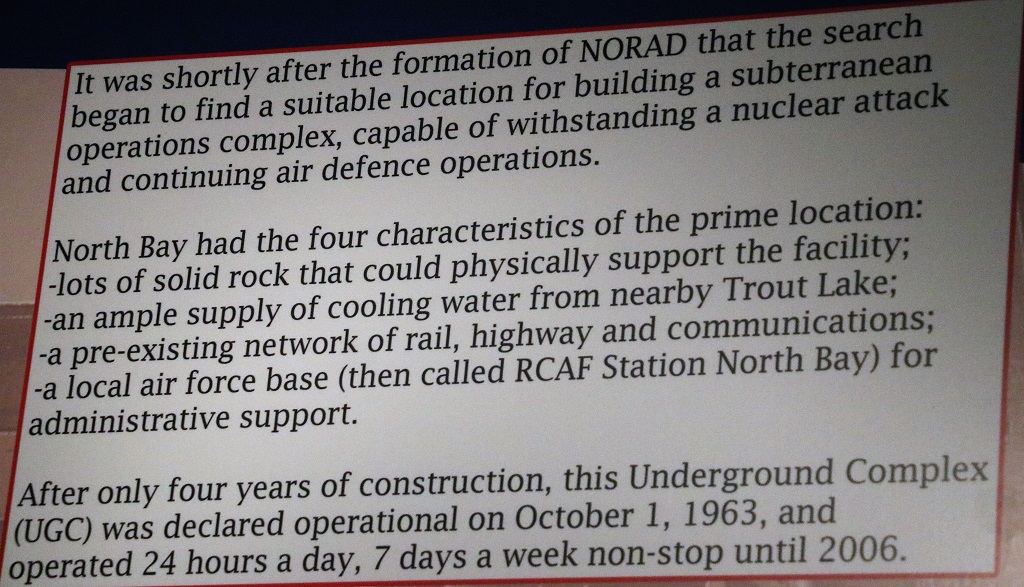The most surprising thing to me was the model of the underground complex at North Bay. It is no longer in use. They moved everything above ground in 2006 but the installation is still there and maintained. The military has not yet figured out how to decommission it and until that is done it is a military base and must be maintained even though it is empty of all equipment and furnishings, etc.