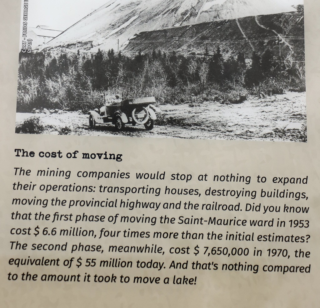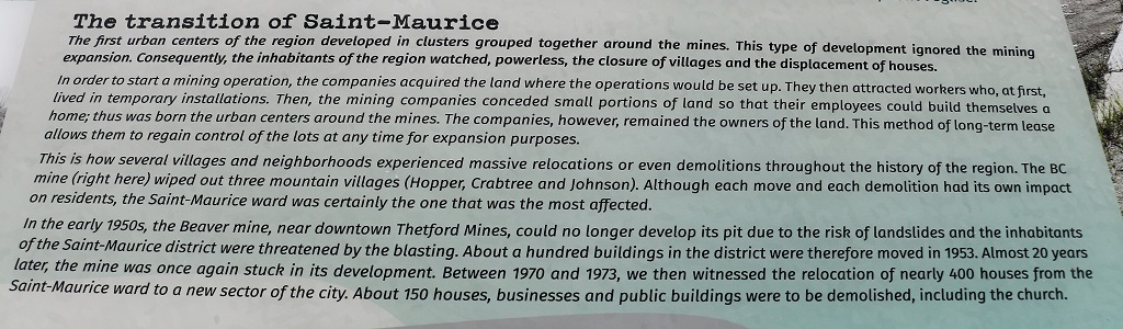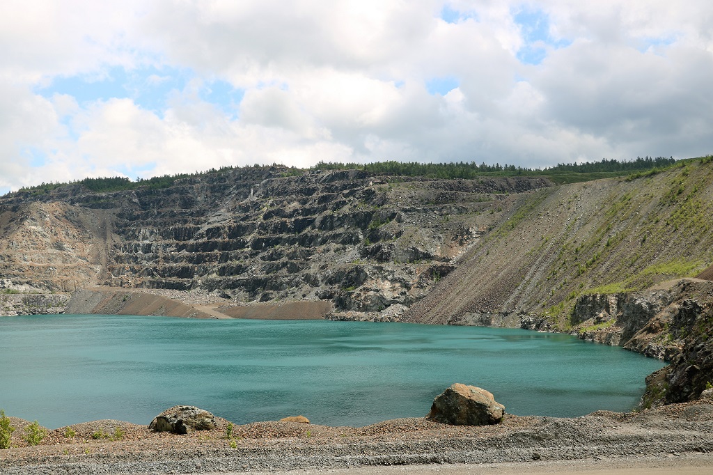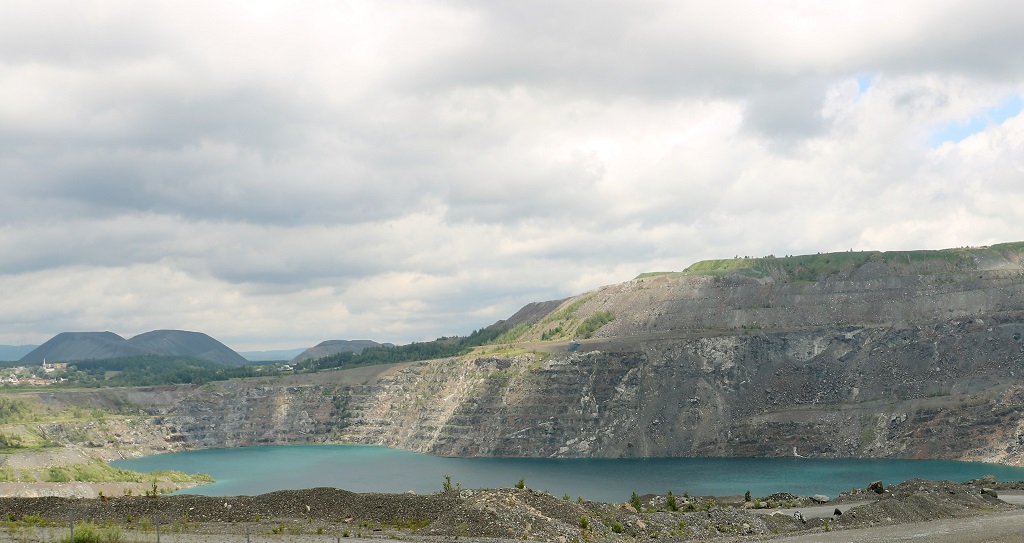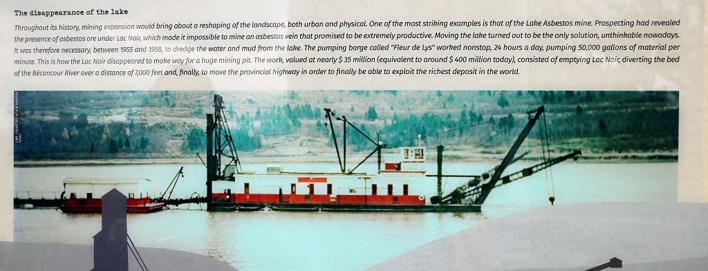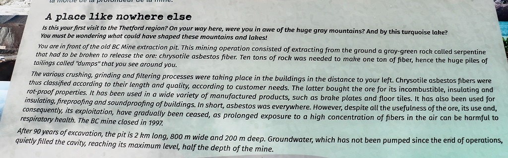Just before the main town of Thetford Mines is a suburb-sort of town called Black Lake. It actually refers to the groundwater that has filled a massive open pit asbestos mine. I managed to snap a photo from the road as we drove by.