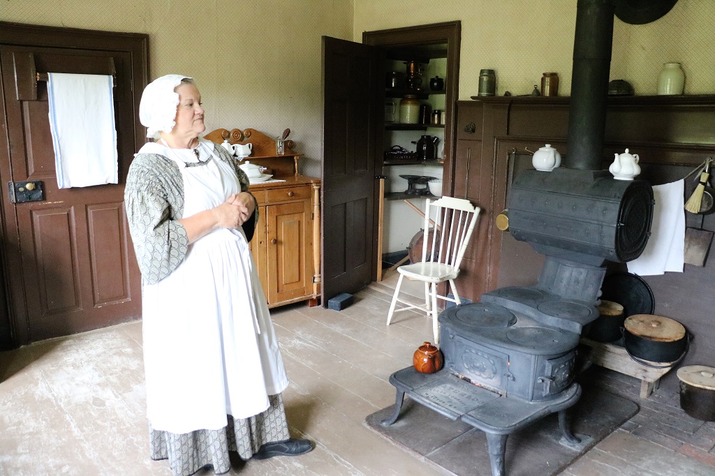 The lady in this house was waiting for her biscuits to finish cooking and had half-made molasses cookies ready to go in the oven when the biscuits came out. A young man and woman arrived at the back door who had brought her some firewood so she gave them a cold glass of water and a piece of cake she had made yesterday.