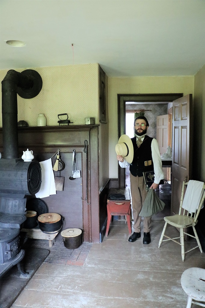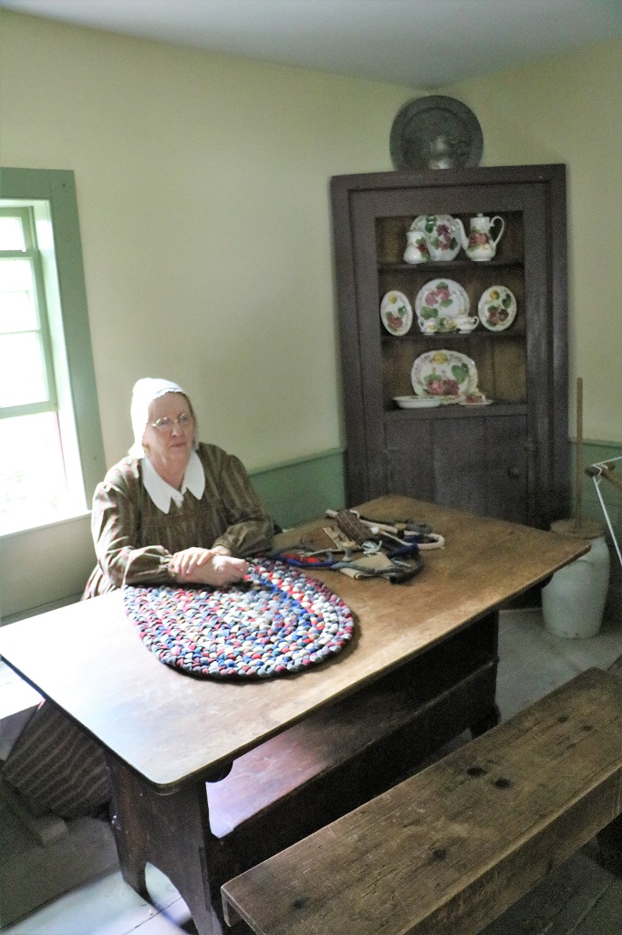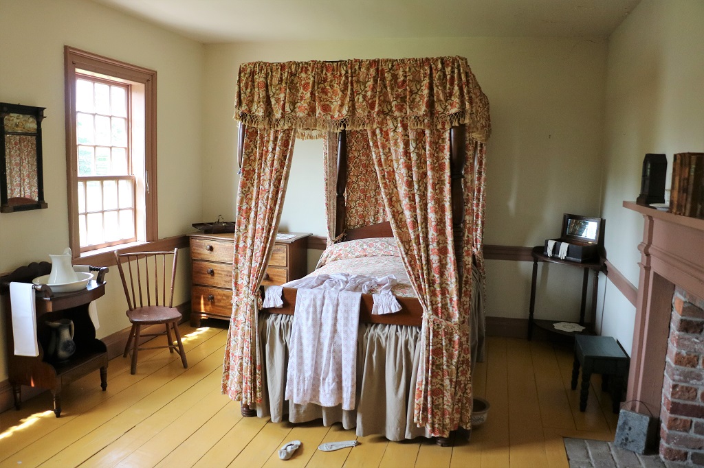 I took only a few photos of the many, many rooms we toured today, but I did love this four-poster bed. All the drapery and linens and quilts are made at the Landing by the staff. As are all the costumes they wear. They have a design and costume shop that researches styles and fabrics and makes – by hand or old period sewing machine – all the clothes worn on the site.