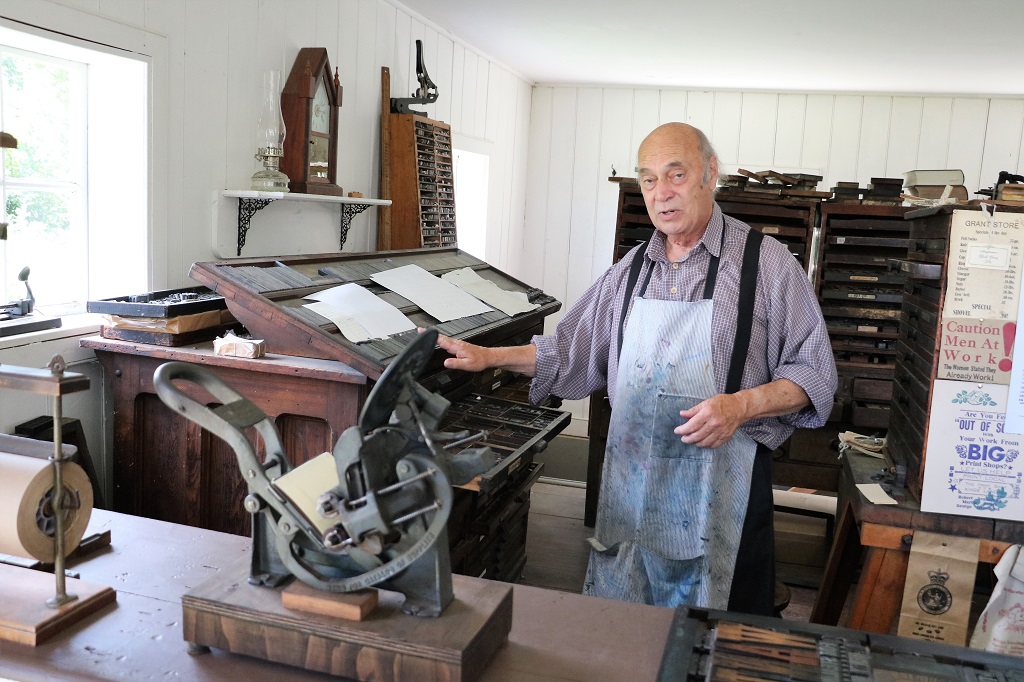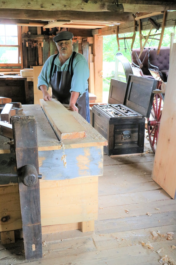 The woodworker was about to make the legs for a table he was working on. He made his toolbox that is on the floor beside him and had several projects to work on throughout the summer. Many of the items that the staff make are put into the end-of-season auction. All the men and women in the buildings are full-time paid employees. Most are retired or semi-retired from other jobs and work at the Landing to earn extra money or to work in a skill or trade they enjoy.