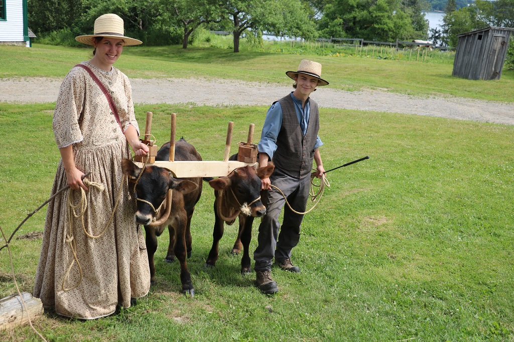 These young ox calves are three months old and are already being trained to work together. They are always led around the grounds tied together so they will automatically work in step when they are hitched to wagons or plows or whatever. Today was the first day they wore the wooden yoke that will later be replaced by harness. They will not be fully grown until about two, but could be working before that if they are strong enough. They were born the same day to twin momma cows. The Landing held a contest to name them and I forgot the name of the one the lady is leading, but the other one’s name is Buckwheat.