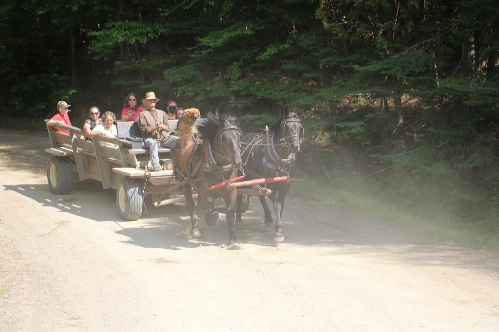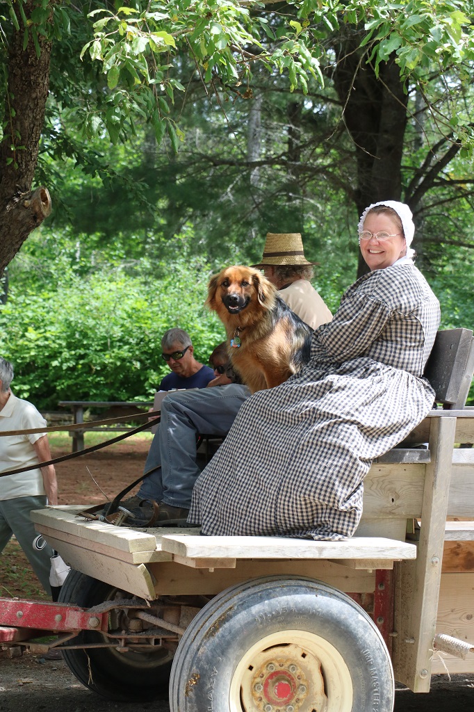 The dog’s name is Finnegan. He is a working dog at the museum. His job is to chase the Canada Geese from the property and when his is not doing that he rides on one of the taxi wagons.