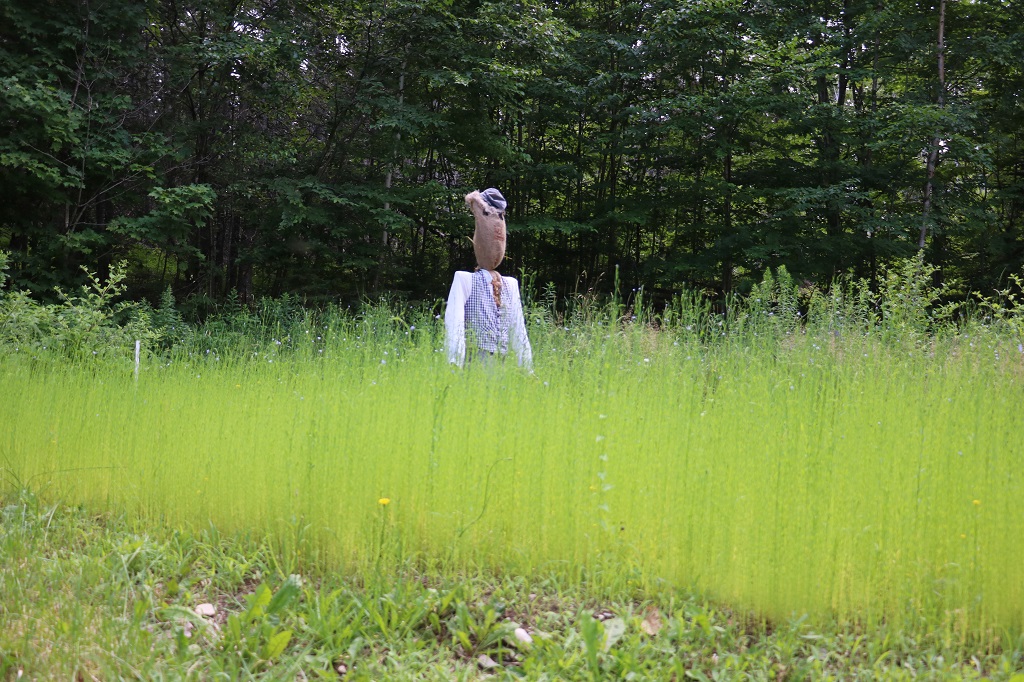 This scarecrow is guarding a garden and a plot of flax. The lady of the house will break it into fiber and then have it spun into yarn (her house was not big enough for a spinning wheel).