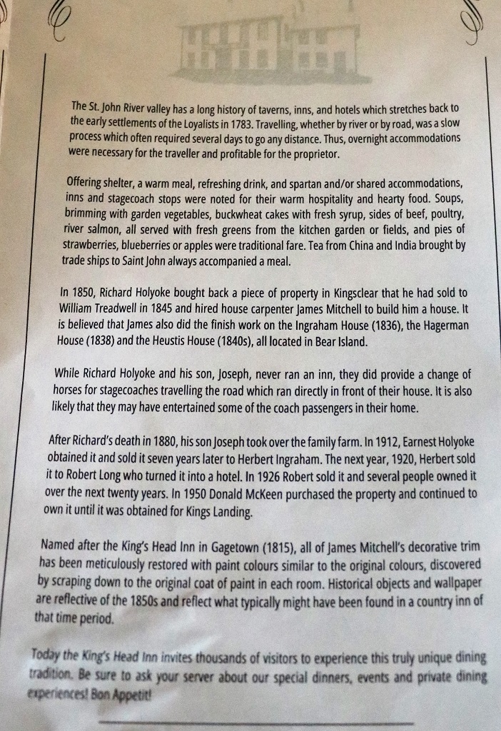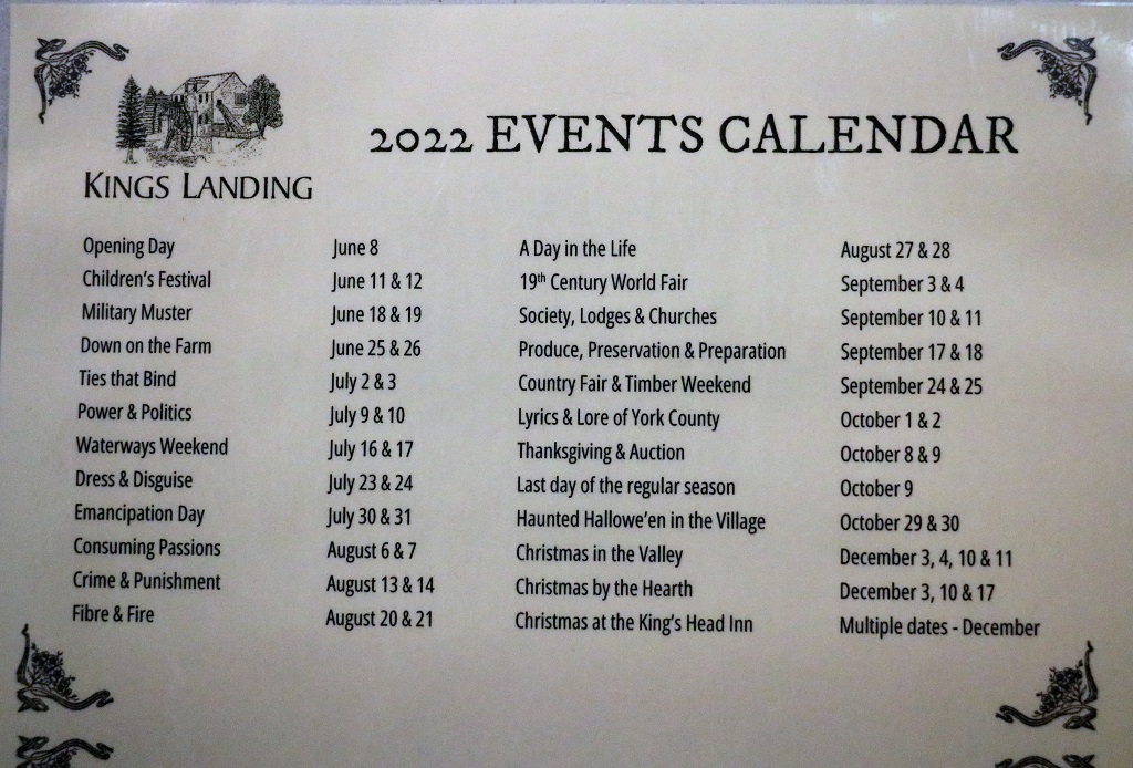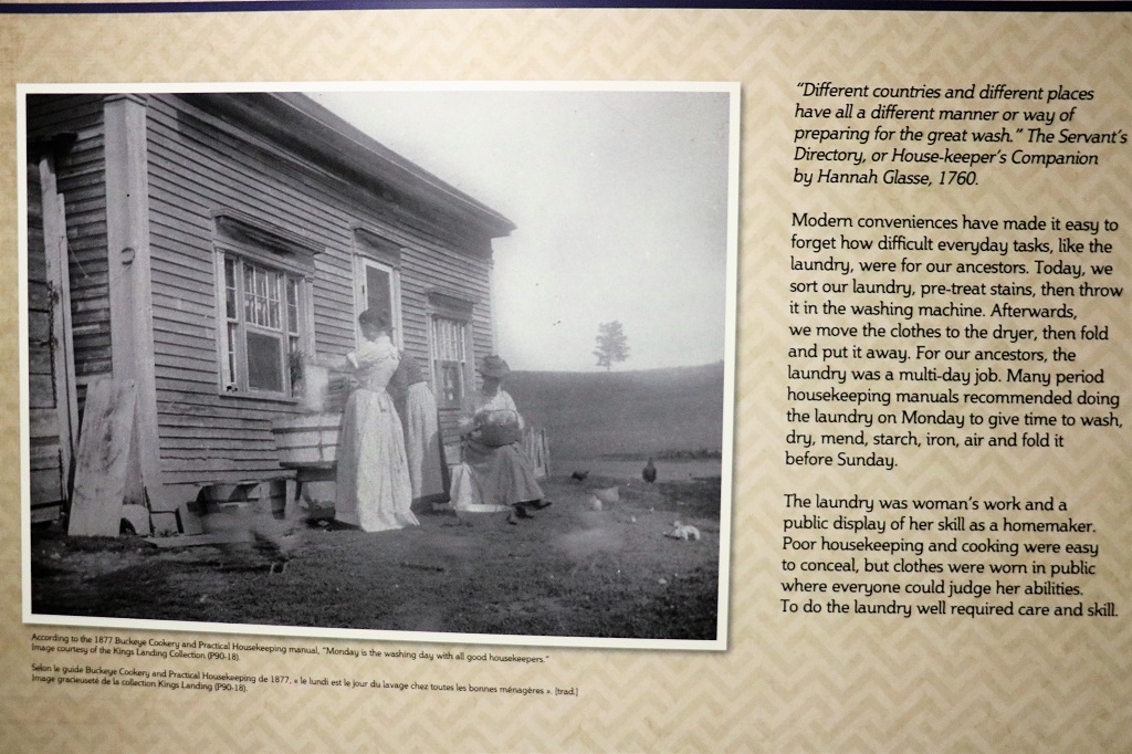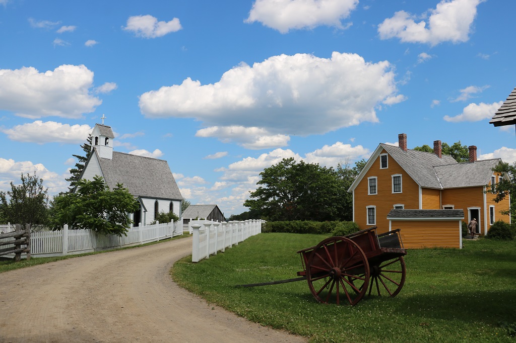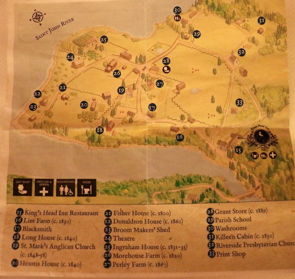 Before we headed to St. John this morning we went over to King’s Landing, which is SW of Fredericton. King’s Landing is situated along the Wolastoq (St. John River), and is a 300-acre museum that is home to over 70,000 artefacts and full of costumed characters, farm animals and 70 historic buildings. The museum opens in June each year and closes at Thanksgiving. It is open Wednesday to Sunday from 10 to 5. Over 100 people are employed to keep the village running, about half of them play the roles of the people that had the businesses, like the blacksmith, or lived in the homes. They speak as if it is about 1860 and will tell you about ‘their’ family that lived in each of the buildings.