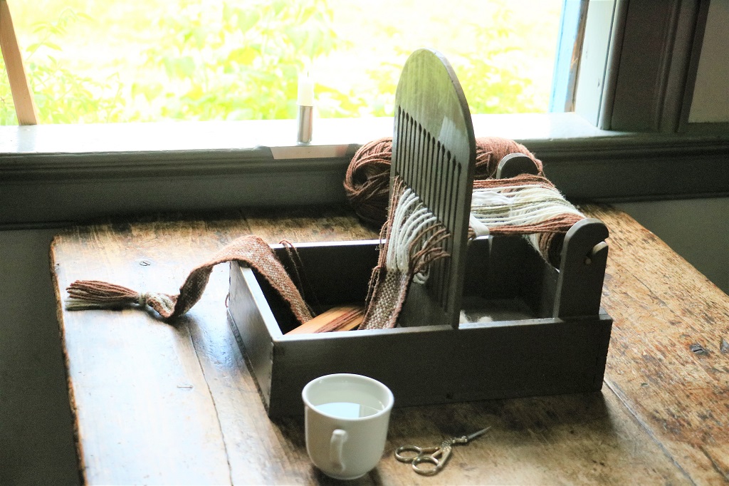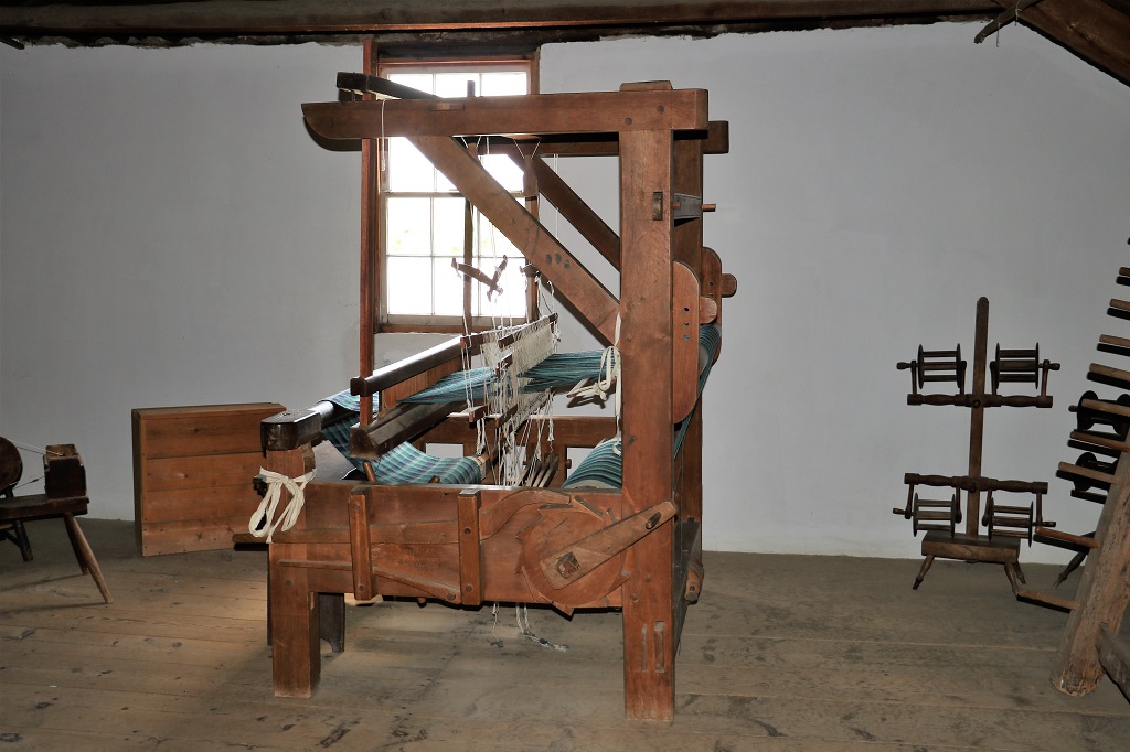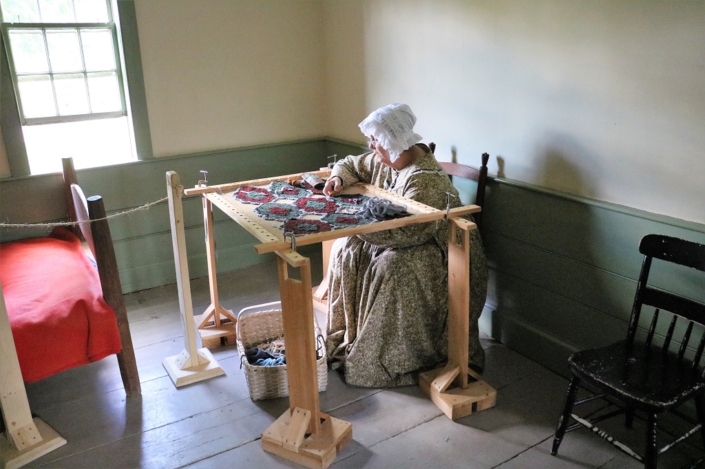 I took only a few photos of the many, many rooms we toured today, but I did love this four-poster bed. All the drapery and linens and quilts are made at the Landing by the staff. As are all the costumes they wear. They have a design and costume shop that researches styles and fabrics and makes – by hand or old period sewing machine – all the clothes worn on the site.