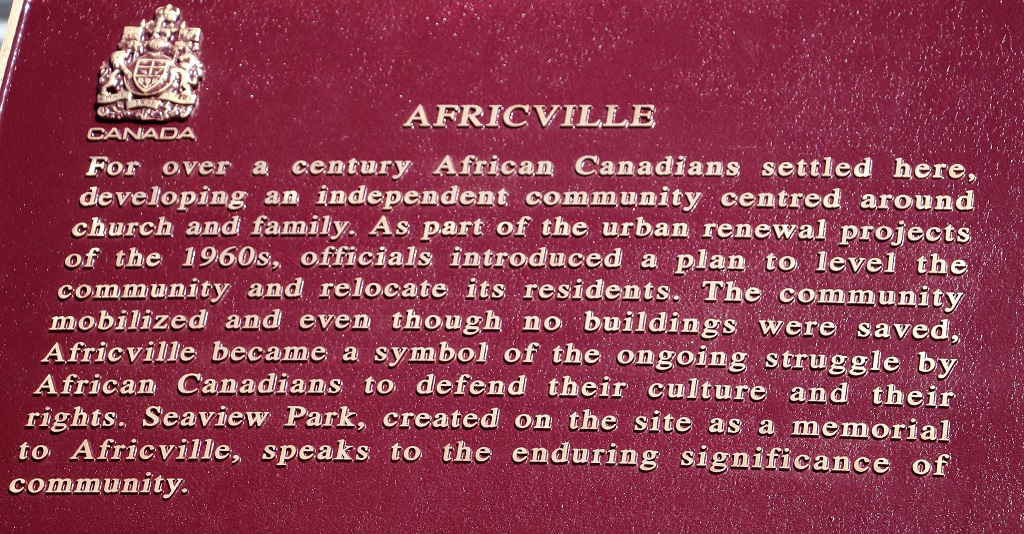 Africville was originally 500 acres of privately owned houses and land and a very tight-knit community. The black residents paid taxes like everyone else in Halifax but never got the services – like clean water after their water was contaminated by the encroaching industrial businesses, or proper sanitation, or electricity. Finally in the early 1960’s the City decided to re-locate all the residents in the interest of urban development and for their own ‘betterment.’ Despite their best efforts and pleas the 400 remaining resident’s land was expropriated, they were moved mostly to low-cost housing, and their homes, church, school, and businesses were bulldozed.