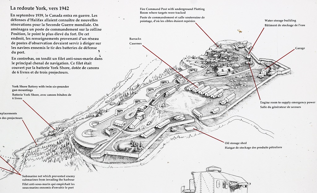The final changes came when Canada declared war on Germany. By 1942 the York Redoubt was overhauled. The Fire Command Post was built on Position Hill, the highest point in the fort. Below the fort, in the main shipping channel, a heavy wire net prevented submarines from slipping into the harbour. The net was protected by York Shore Battery, with its six-pounder guns and three searchlights.