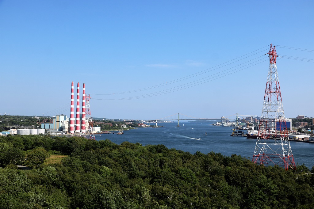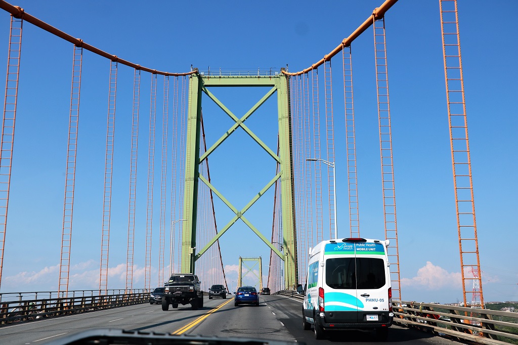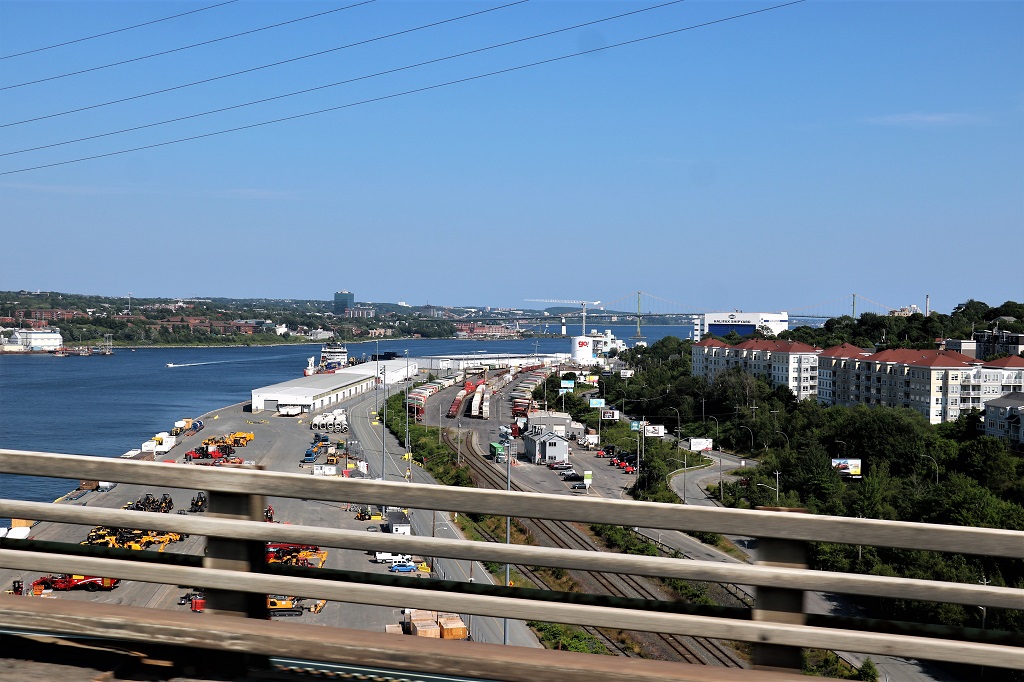 The A. Murray Mackay bridge between Halifax and Dartmouth. It is a toll bridge ($1.25), built in 1970. 52,000 vehicles cross it every day. It is the only harbour bridge that allows semi-trailers and large trucks. Pedestrians and bicycles are not allowed.