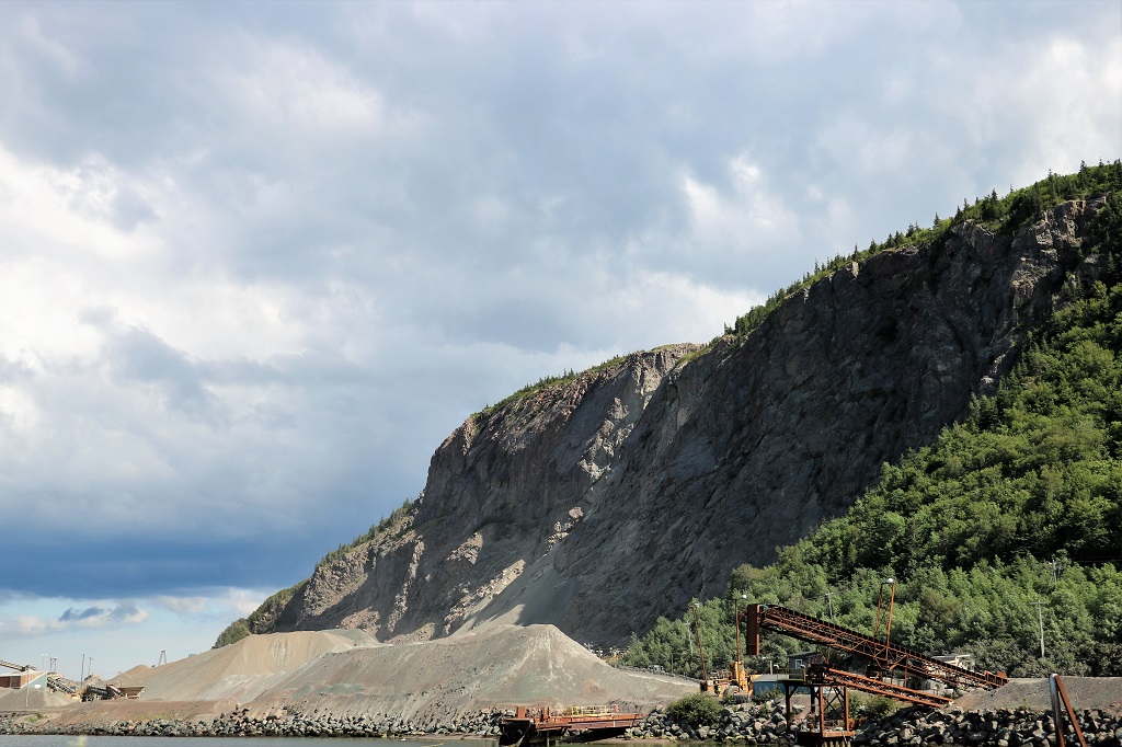 This huge cliff is at the causeway across the Strait of Canso, called the Canso Gut. which separates Cape Breton Island from the Nova Scotia mainland. The Strait is about 27 km (17 miles) long and 3 km (2 miles) wide with depths of more than 60 meters (200′). The 7,000 foot causeway was completed in 1955 and carries rail and Trans-Canada Highway traffic.