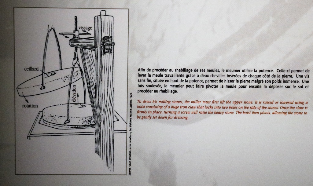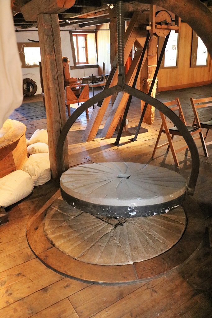 There was only one thing inside the mill that I photographed. We had been told about the miller having to lift the millstones and ‘dress’ them (make sure the grooves were clean so there would be no wear spots), but the Old Balmoral Grist Mill did not have the hoist pieces. This mill did. Each of the millstones weighs a ton so they use the hoist to lift the top one off and swivel it to the side so each stone can be cleaned and checked.