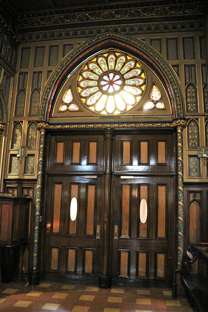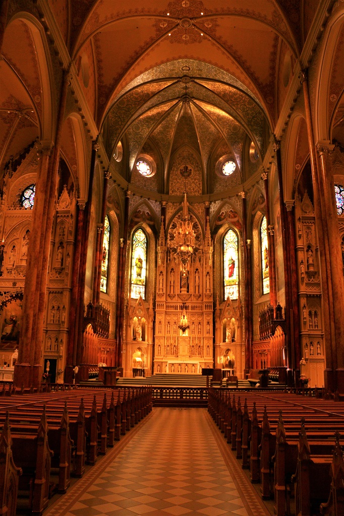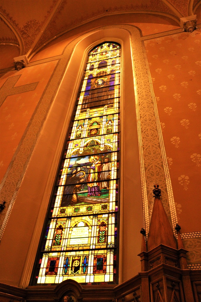 After a delicious cinnamon pastry for lunch we walked up a few blocks and visited St. Patrick’s Basilica which was built by the Irish Catholics. It was very dark inside, even with lights on. Everything was brown, or shades of brown. Even with a very high ISO setting on the camera the photos are dark. I had to do a bit of filtering and editing to make them somewhat clear.