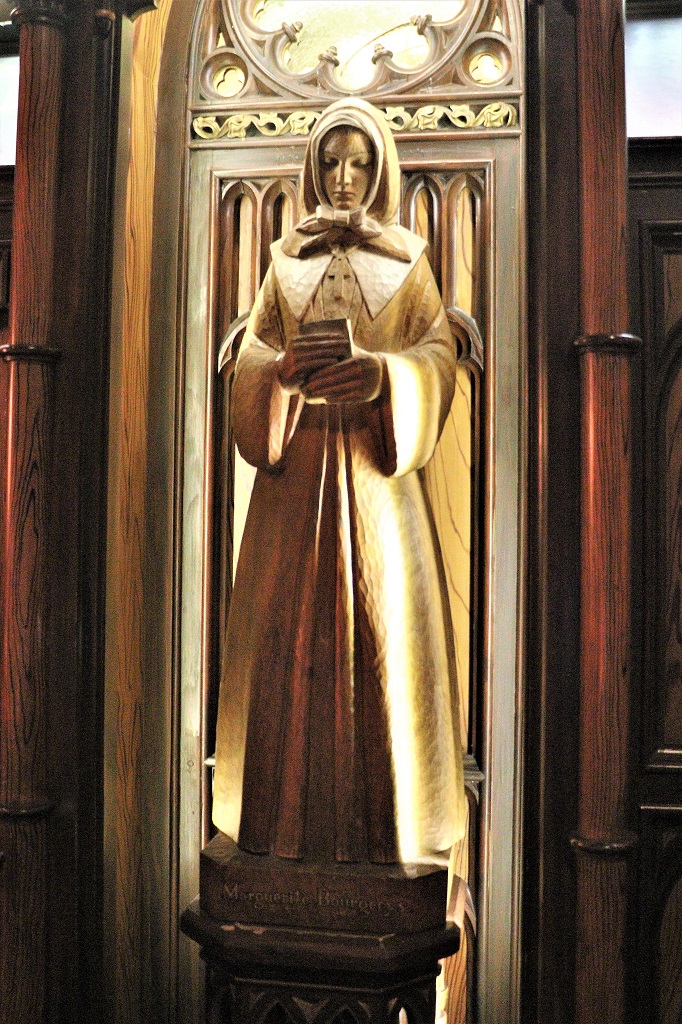 This sculpture of Marguerite Bourgeoys was made by Sylvia Daoust. It did not say in what year. She was the founder of the congretation of Notre-Dame. It is carved from wood.