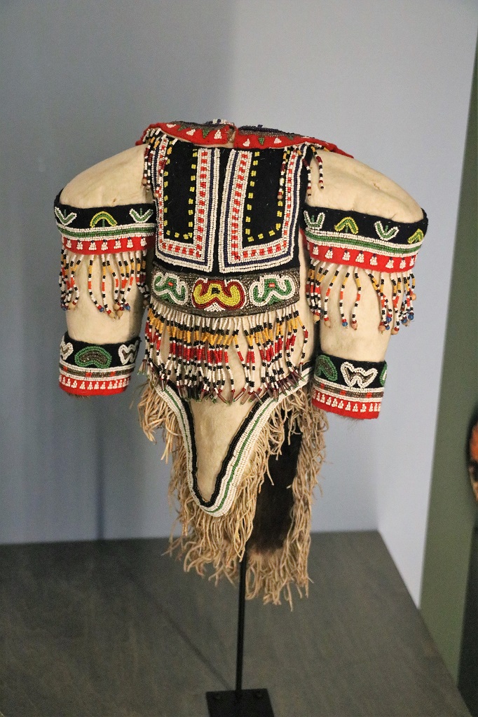 John and I thought this mantle was made from porcupine quills, but the description list says it is dentalium shells that would have been acquired through trade. It is from the late 1800s and the Northern Plains. Dentalium shells are a type of seashell.